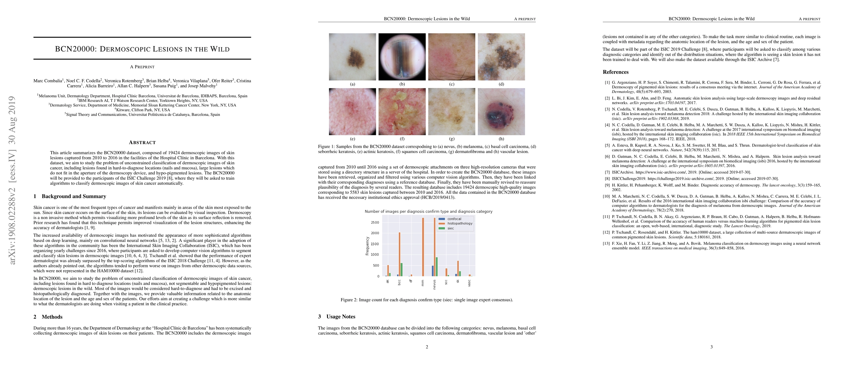 This article summarizes the BCN20000 dataset, composed of 19424 dermoscopic images of skin lesions captured from 2010 to 2016 in the facilities of the Hospital Cl\'inic in Barcelona. With this dataset, we aim to study the problem of unconstrained classification of dermoscopic images of skin cancer, including lesions found in hard-to-diagnose locations (nails and mucosa), large lesions which do not fit in the aperture of the dermoscopy device, and hypo-pigmented lesions. The BCN20000 will be provided to the participants of the ISIC Challenge 2019, where they will be asked to train algorithms to classify dermoscopic images of skin cancer automatically.