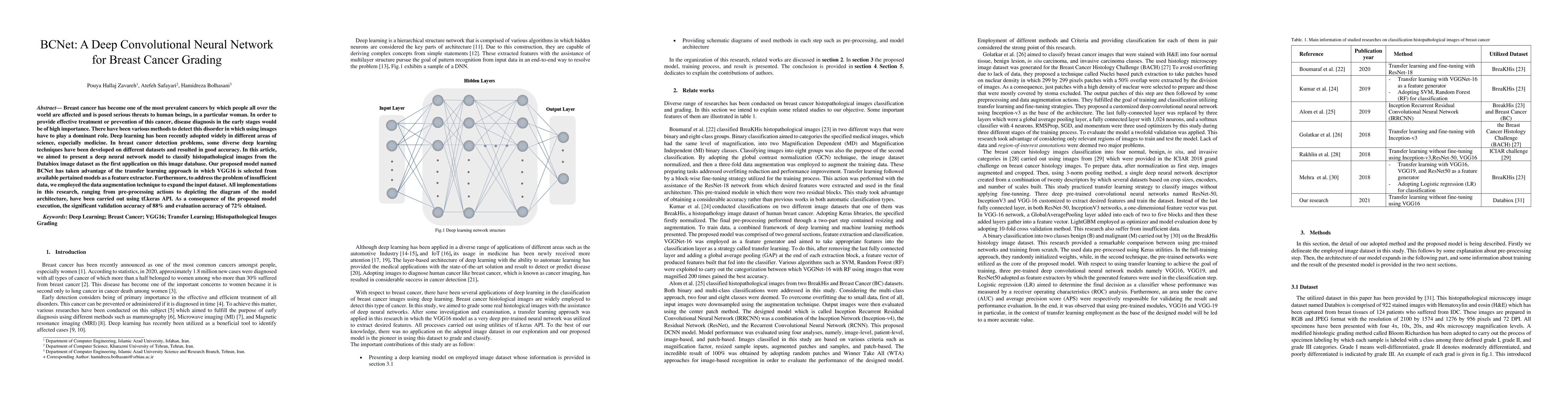 Breast cancer has become one of the most prevalent cancers by which people all over the world are affected and is posed serious threats to human beings, in a particular woman. In order to provide effective treatment or prevention of this cancer, disease diagnosis in the early stages would be of high importance. There have been various methods to detect this disorder in which using images have to play a dominant role. Deep learning has been recently adopted widely in different areas of science, especially medicine. In breast cancer detection problems, some diverse deep learning techniques have been developed on different datasets and resulted in good accuracy. In this article, we aimed to present a deep neural network model to classify histopathological images from the Databiox image dataset as the first application on this image database. Our proposed model named BCNet has taken advantage of the transfer learning approach in which VGG16 is selected from available pertained models as a feature extractor. Furthermore, to address the problem of insufficient data, we employed the data augmentation technique to expand the input dataset. All implementations in this research, ranging from pre-processing actions to depicting the diagram of the model architecture, have been carried out using tf.keras API. As a consequence of the proposed model execution, the significant validation accuracy of 88% and evaluation accuracy of 72% obtained.