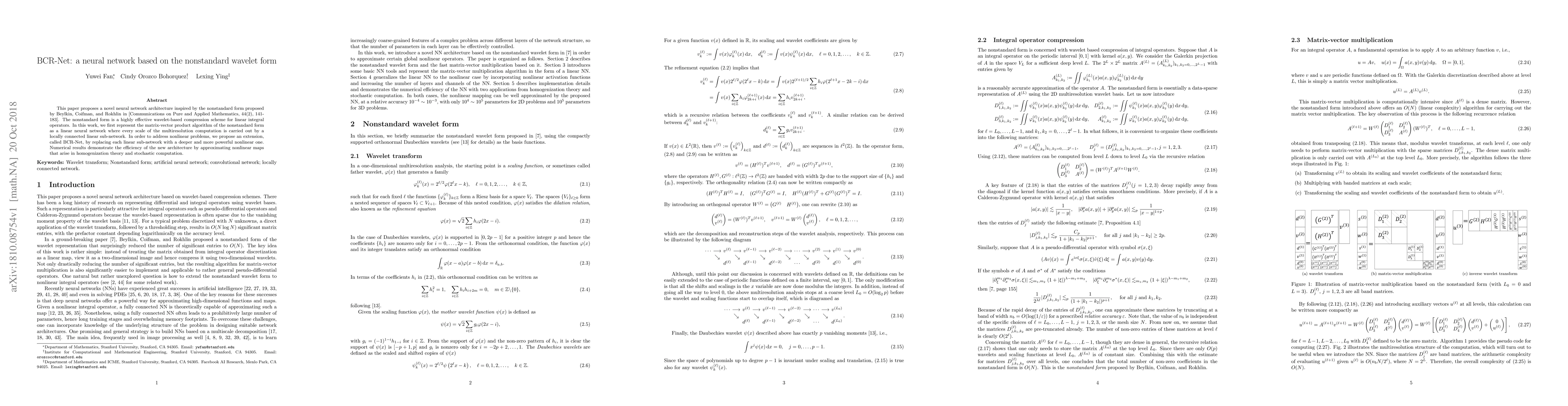 This paper proposes a novel neural network architecture inspired by the nonstandard form proposed by Beylkin, Coifman, and Rokhlin in [Communications on Pure and Applied Mathematics, 44(2), 141-183]. The nonstandard form is a highly effective wavelet-based compression scheme for linear integral operators. In this work, we first represent the matrix-vector product algorithm of the nonstandard form as a linear neural network where every scale of the multiresolution computation is carried out by a locally connected linear sub-network. In order to address nonlinear problems, we propose an extension, called BCR-Net, by replacing each linear sub-network with a deeper and more powerful nonlinear one. Numerical results demonstrate the efficiency of the new architecture by approximating nonlinear maps that arise in homogenization theory and stochastic computation.