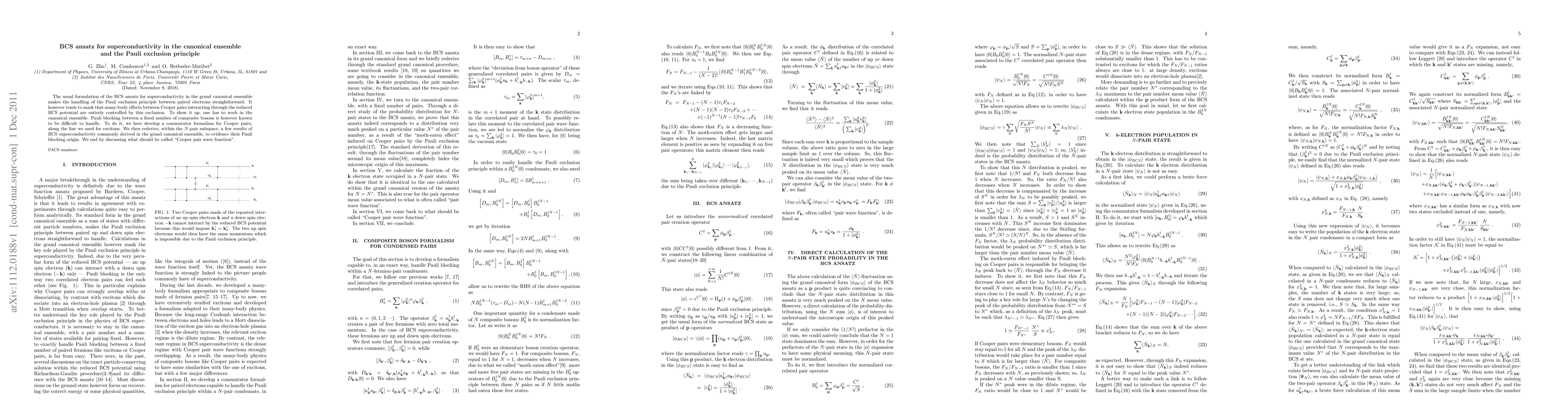 The usual formulation of the BCS ansatz for superconductivity in the grand canonical ensemble makes the handling of the Pauli exclusion principle between paired electrons straightforward. It however tends to mask that many-body effects between Cooper pairs interacting through the reduced BCS potential are entirely controlled by this exclusion. To show it up, one has to work in the canonical ensemble. Pauli blocking between a fixed number of composite bosons is however known to be difficult to handle. To do it, we here develop a commutator formalism for Cooper pairs, along the line we used for excitons. We then rederive, within the $N$-pair subspace, a few results of BCS superconductivity commonly derived in the grand canonical ensemble, to evidence their Pauli blocking origin. We end by discussing what should be called "Cooper pair wave function".