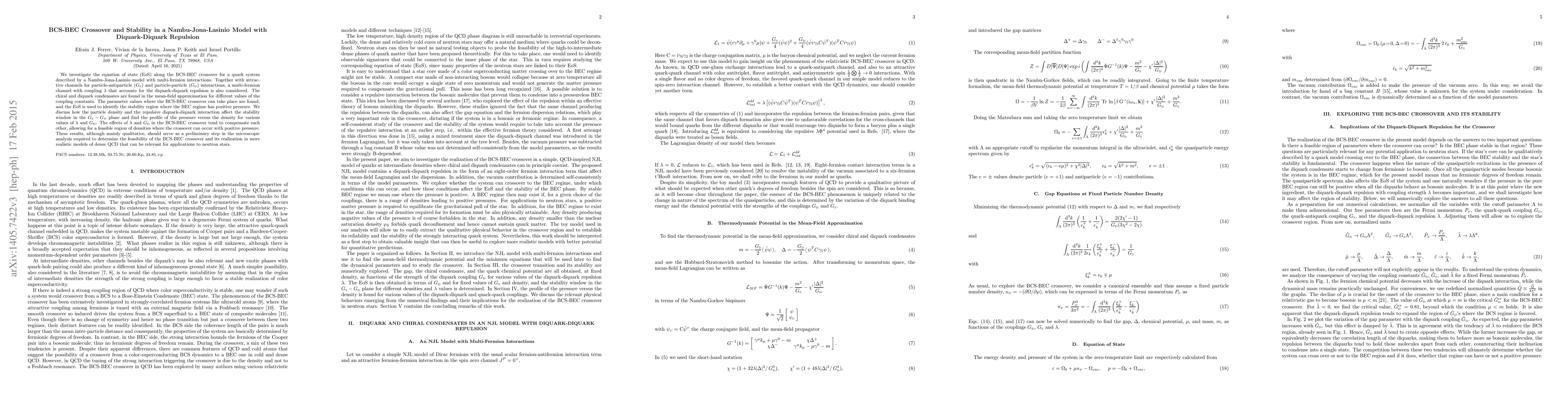 We investigate the equation of state (EoS) along the BCS-BEC crossover for a quark system described by a Nambu-Jona-Lasinio model with multi-fermion interactions. Together with attractive channels for particle-antiparticle ($\Gs$) and particle-particle ($\Gd$) interactions, a multi-fermion channel with coupling $\lambda$ that accounts for the diquark-diquark repulsion is also considered. The chiral and diquark condensates are found in the mean-field approximation for different values of the coupling constants. The parameter values where the BCS-BEC crossover can take place are found, and the EoS is used to identify the stability region where the BEC regime has positive pressure. We discuss how the particle density and the repulsive diquark-diquark interaction affect the stability window in the $\Gs-\Gd$ plane and find the profile of the pressure versus the density for various values of $\lambda$ and $\Gd$. The effects of $\lambda$ and $\Gd$ in the BCS-BEC crossover tend to compensate each other, allowing for a feasible region of densities where the crossover can occur with positive pressure. These results, although mainly qualitative, should serve as a preliminary step in the microscopic analysis required to determine the feasibility of the BCS-BEC crossover and its realization in more realistic models of dense QCD that can be relevant for applications to neutron stars.
