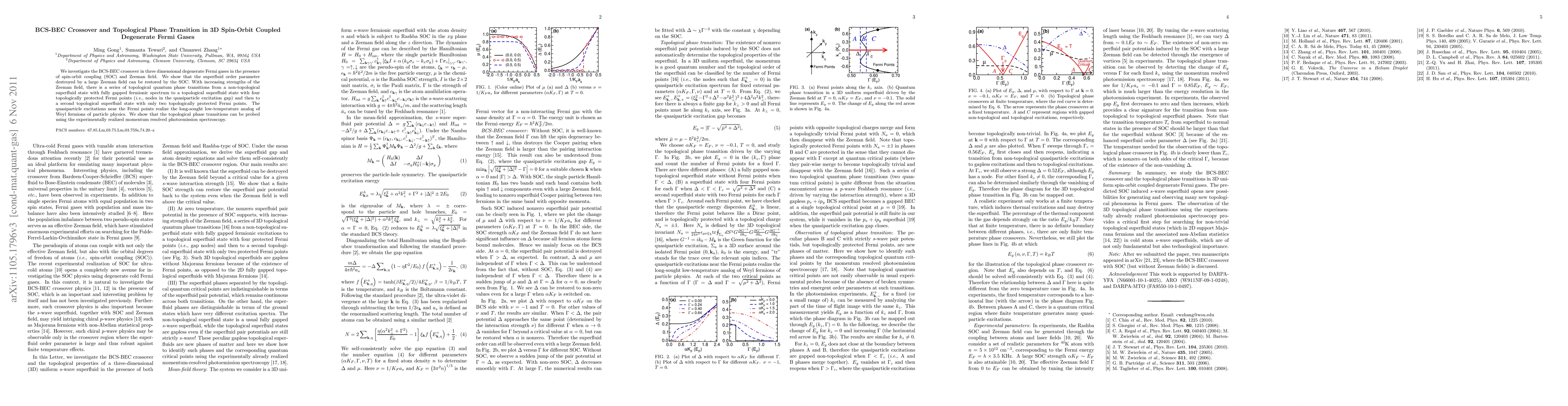 This paper investigates the BCS-BEC crossover in 3D degenerate Fermi gases with spin-orbit coupling and Zeeman fields, demonstrating that spin-orbit coupling can restore superfluid order destroyed by Zeeman fields. It identifies topological phase transitions leading to states with varying numbers of topologically protected Fermi points, and suggests that these transitions can be detected via momentum-resolved photoemission spectroscopy.