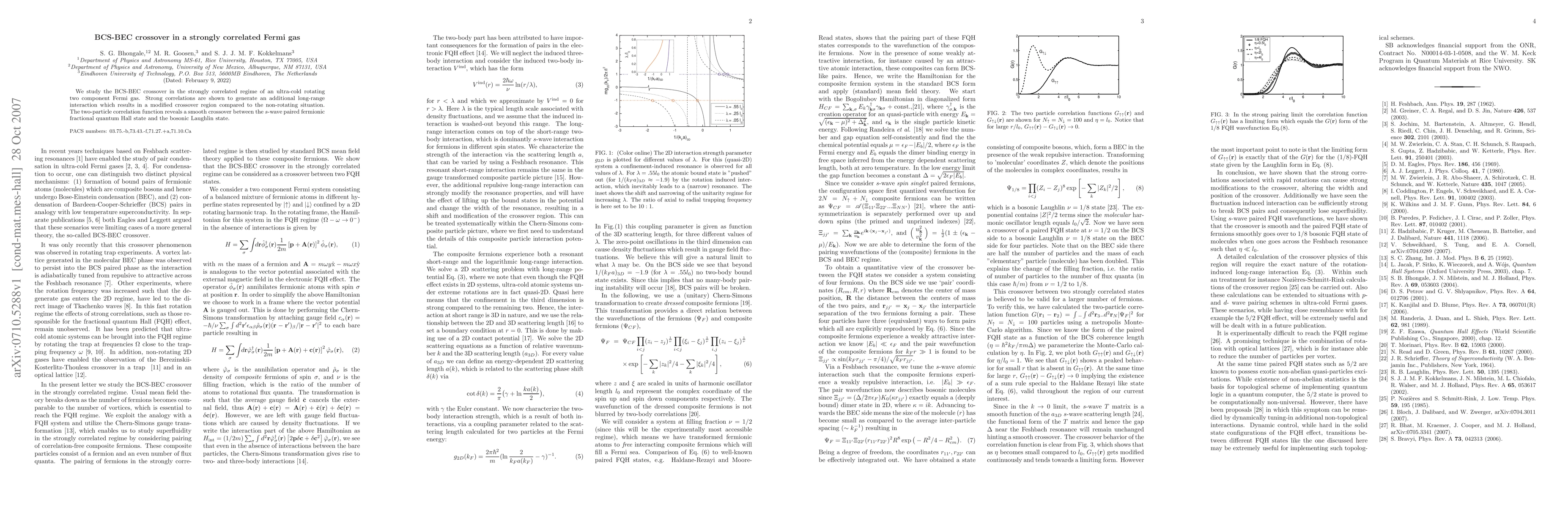 This study investigates the BCS-BEC crossover in a strongly correlated, ultra-cold rotating Fermi gas, revealing that strong correlations induce a long-range interaction, altering the crossover region. The two-particle correlation function demonstrates a seamless transition between fermionic fractional quantum Hall and bosonic Laughlin states.