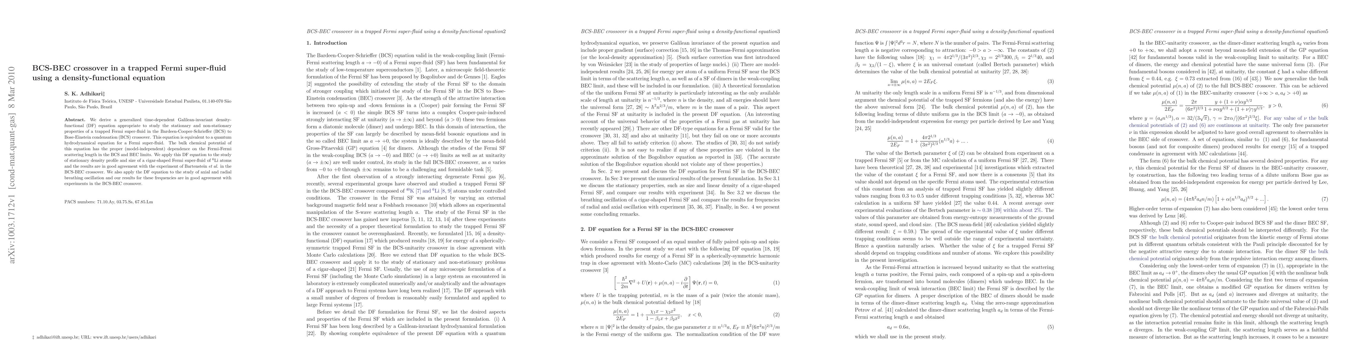 We derive a generalized time-dependent Galilean-invariant density-functional (DF) equation appropriate to study the stationary and non-stationary properties of a trapped Fermi super-fluid in the Bardeen-Cooper-Schrieffer (BCS) to Bose-Einstein condensation (BCS) crossover. This equation is equivalent to a quantum hydrodynamical equation for a Fermi super-fluid. The bulk chemical potential of this equation has the proper (model-independent) dependence on the Fermi-Fermi scattering length in the BCS and BEC limits. We apply this DF equation to the study of stationary density profile and size of a cigar-shaped Fermi super-fluid of $^6$Li atoms and the results are in good agreement with the experiment of Bartenstein {\it et al.} in the BCS-BEC crossover. We also apply the DF equation to the study of axial and radial breathing oscillation and our results for these frequencies are in good agreement with experiments in the BCS-BEC crossover.
