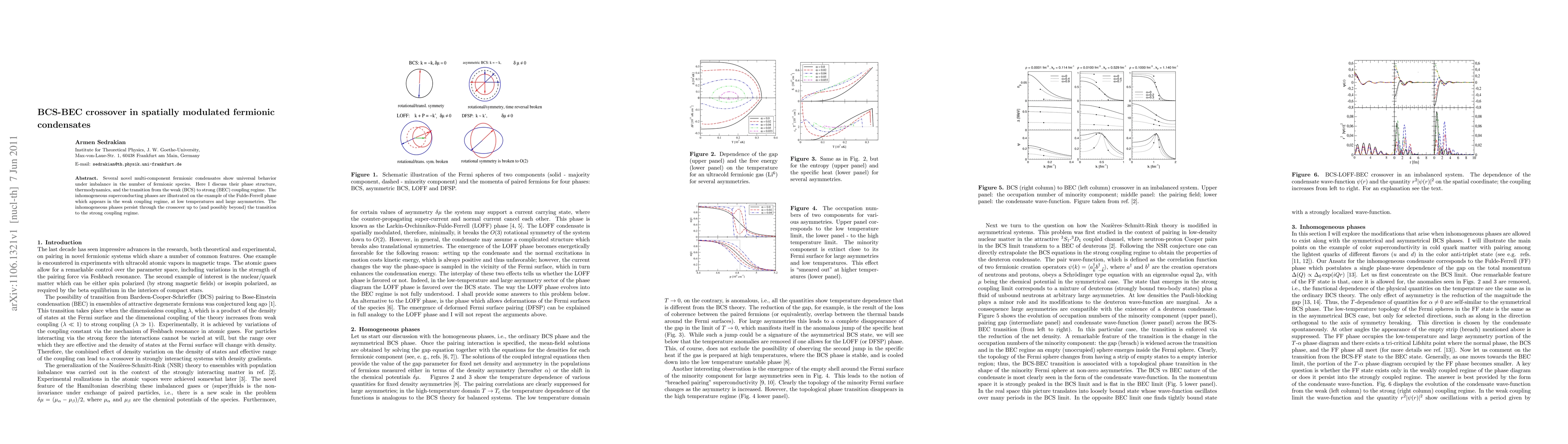 This paper explores the phase structure and thermodynamics of multi-component fermionic condensates, focusing on the transition from BCS to BEC coupling regimes. It highlights the persistence of inhomogeneous superconducting phases, such as the Fulde-Ferrell phase, through the BCS-BEC crossover.