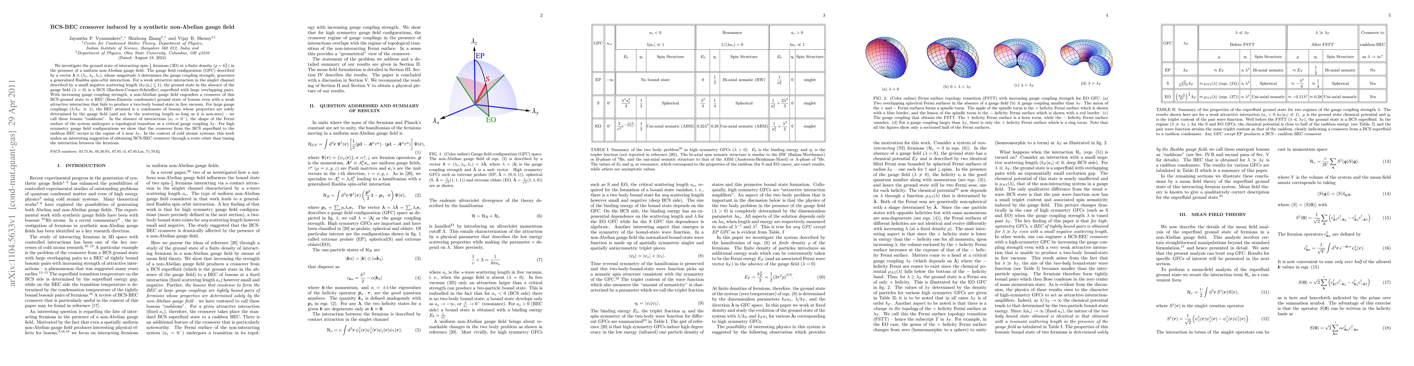 We investigate the ground state of interacting spin-$\half$ fermions (3D) at a finite density ($\rho \sim \kf^3$) in the presence of a uniform non-Abelian gauge field. The gauge field configuration (GFC) described by a vector $\blam \equiv (\lambda_x, \lambda_y, \lambda_z)$, whose magnitude $\lambda$ determines the gauge coupling strength, generates a generalized Rashba spin-orbit interaction. For a weak attractive interaction in the singlet channel described by a small negative scattering length $(\kf |\as| \lesssim 1)$, the ground state in the absence of the gauge field ($\lambda=0$) is a BCS (Bardeen-Cooper-Schrieffer) superfluid with large overlapping pairs. With increasing gauge coupling strength, a non-Abelian gauge field engenders a crossover of this BCS ground state to a BEC (Bose-Einstein condensate) ground state of bosons even with a weak attractive interaction that fails to produce a two-body bound state in free vacuum. For large gauge couplings $(\lambda/\kf \gg 1)$, the BEC attained is a condensate of bosons whose properties are solely determined by the gauge field (and not by the scattering length so long as it is non-zero) -- we call these bosons "rashbons". In the absence of interactions ($\as = 0^-$), the shape of the Fermi surface of the system undergoes a topological transition at a critical gauge coupling $\lambda_T$. For high symmetry gauge field configurations we show that the crossover from the BCS superfluid to the rashbon BEC occurs in the regime of $\lambda$ near $\lambda_T$. In the context of cold atomic systems, this work makes an interesting suggestion of obtaining BCS-BEC crossover through a route other than tuning the interaction between the fermions.