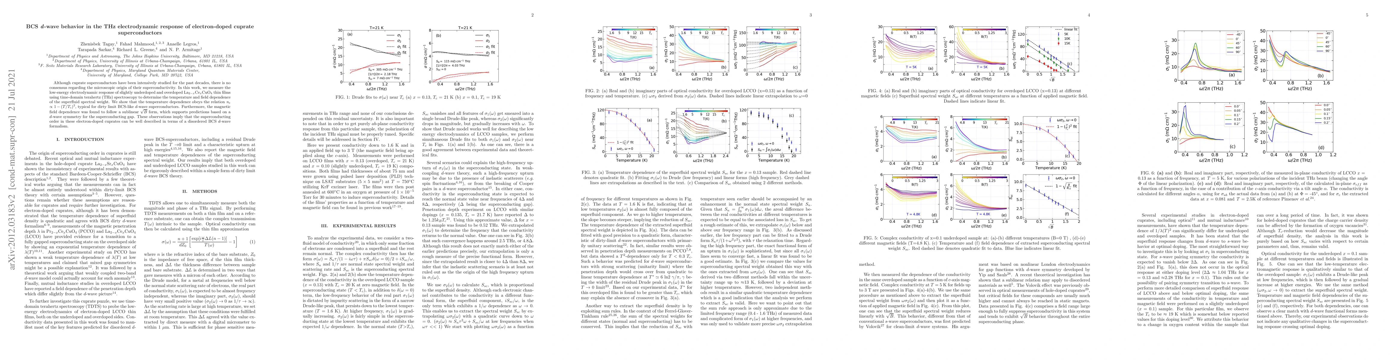 This study uses THz spectroscopy to analyze the electrodynamic response of La$_{2-x}$Ce$_x$CuO$_4$ thin films, revealing a BCS $d$-wave behavior in their superconductivity characterized by a temperature dependence of \textit{n$_s$} $\propto$ $1-(T/T_c)^2$ and a sublinear $\sqrt{B}$ magnetic field dependence. These findings support a disordered BCS $d$-wave model for the superconducting order in electron-doped cuprates.