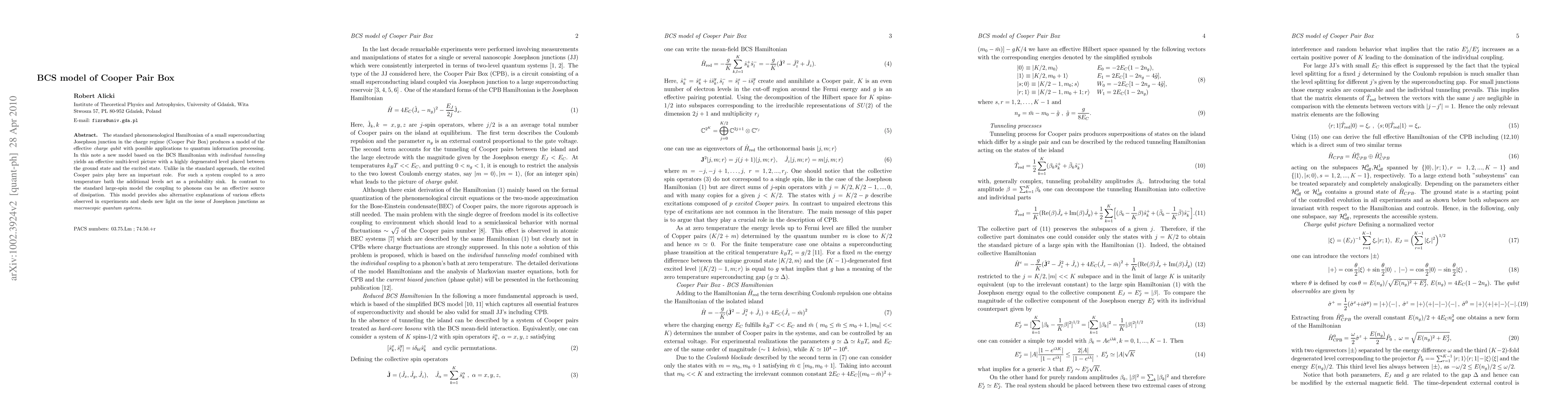 The research presents a new model of a Cooper Pair Box based on the BCS Hamiltonian with individual tunneling, contrasting with the standard large-spin model.