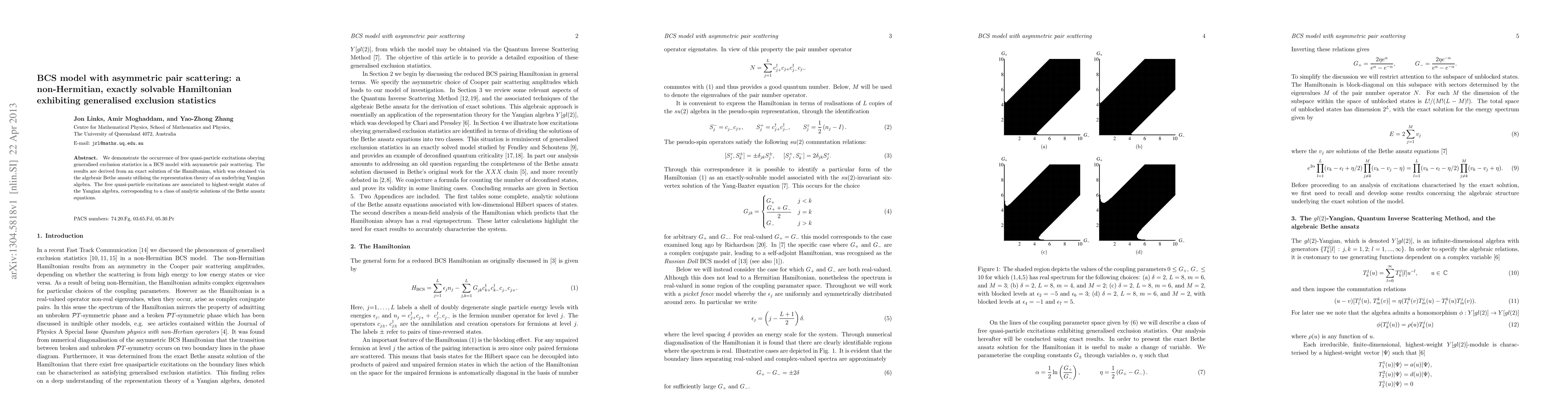 We demonstrate the occurrence of free quasi-particle excitations obeying generalised exclusion statistics in a BCS model with asymmetric pair scattering. The results are derived from an exact solution of the Hamiltonian, which was obtained via the algebraic Bethe ansatz utilising the representation theory of an underlying Yangian algebra. The free quasi-particle excitations are associated to highest-weight states of the Yangian algebra, corresponding to a class of analytic solutions of the Bethe ansatz equations.