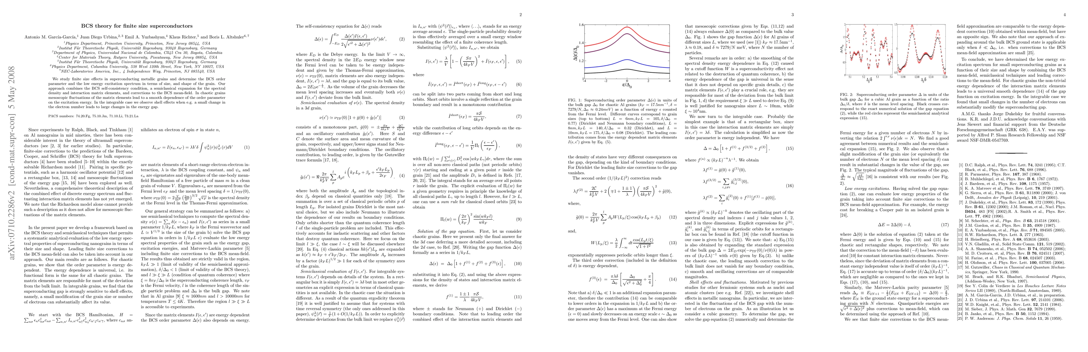 We study finite size effects in superconducting metallic grains and determine the BCS order parameter and the low energy excitation spectrum in terms of size, and shape of the grain. Our approach combines the BCS self-consistency condition, a semiclassical expansion for the spectral density and interaction matrix elements, and corrections to the BCS mean-field. In chaotic grains mesoscopic fluctuations of the matrix elements lead to a smooth dependence of the order parameter on the excitation energy. In the integrable case we observe shell effects when e.g. a small change in the electron number leads to large changes in the energy gap.