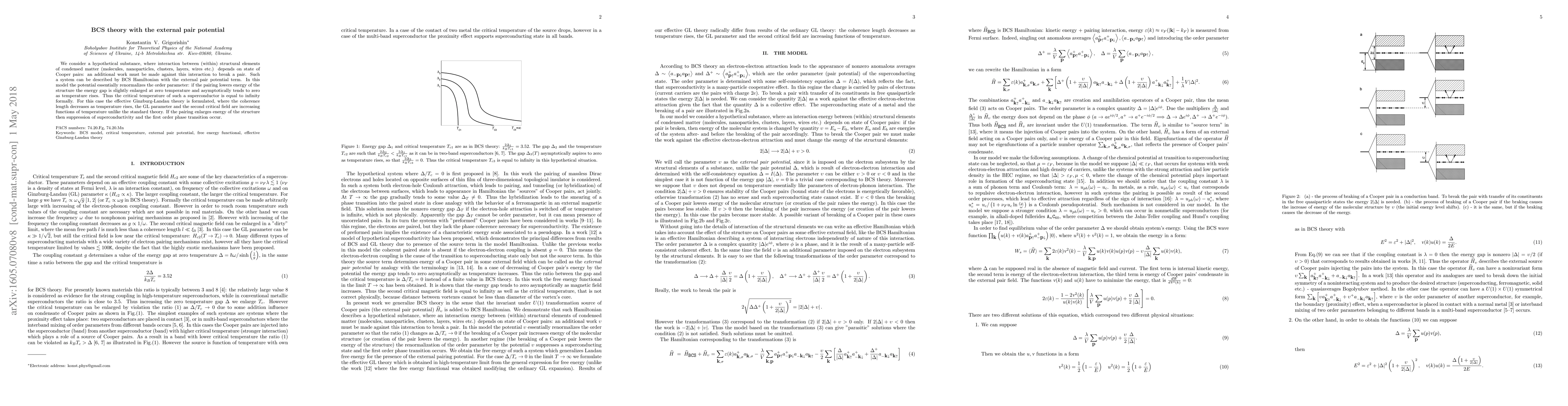 We consider a hypothetical substance, where interaction between (within) structural elements of condensed matter (molecules, nanoparticles, clusters, layers, wires etc.) depends on state of Cooper pairs: an additional work must be made against this interaction to break a pair. Such a system can be described by BCS Hamiltonian with the external pair potential term. In this model the potential essentially renormalizes the order parameter: if the pairing lowers energy of the structure the energy gap is slightly enlarged at zero temperature and asymptotically tends to zero as temperature rises. Thus the critical temperature of such a superconductor is equal to infinity formally. For this case the effective Ginzburg-Landau theory is formulated, where the coherence length decreases as temperature rises, the GL parameter and the second critical field are increasing functions of temperature unlike the standard theory. If the pairing enlarges energy of the structure then suppression of superconductivity and the first order phase transition occur.