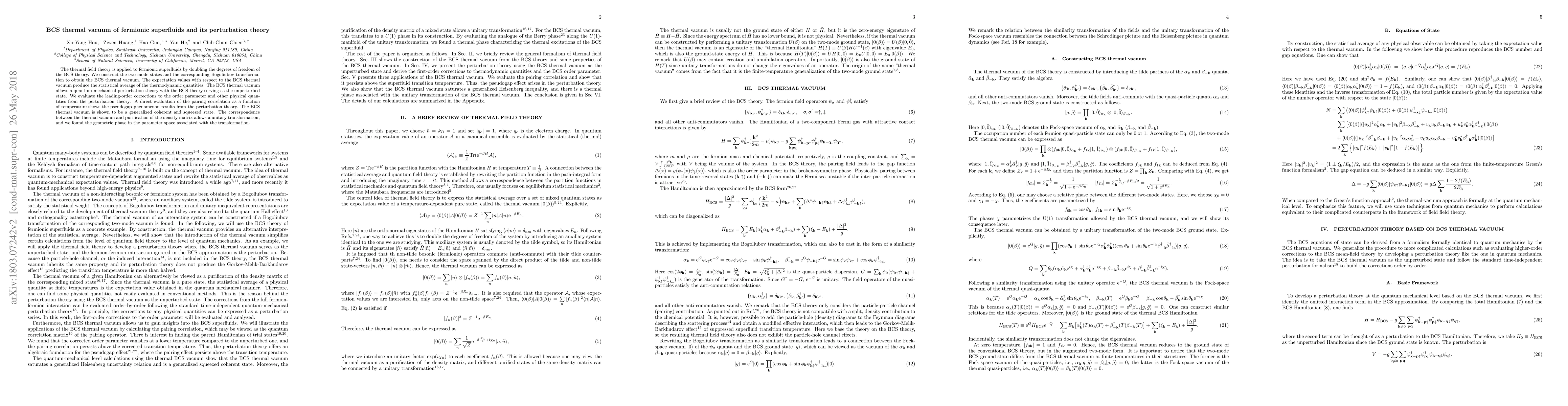 This paper applies thermal field theory to fermionic superfluids by extending BCS theory, constructing the BCS thermal vacuum through a Bogoliubov transformation. It evaluates leading-order corrections to thermodynamic quantities and identifies the pseudogap phenomenon, demonstrating the BCS thermal vacuum as a generalized coherent and squeezed state with a geometric phase in parameter space.