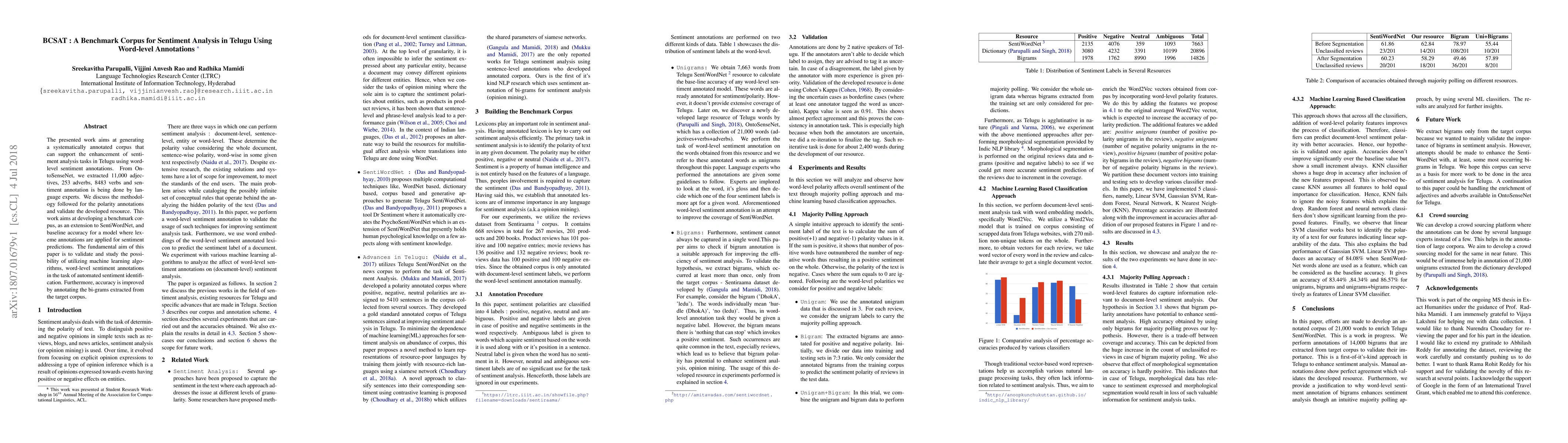 This paper introduces BCSAT, a benchmark corpus for Telugu sentiment analysis, featuring word-level annotations for 11,000 adjectives, 253 adverbs, and 8,483 verbs. The corpus aims to enhance sentiment analysis models and includes bi-gram annotations to improve accuracy.