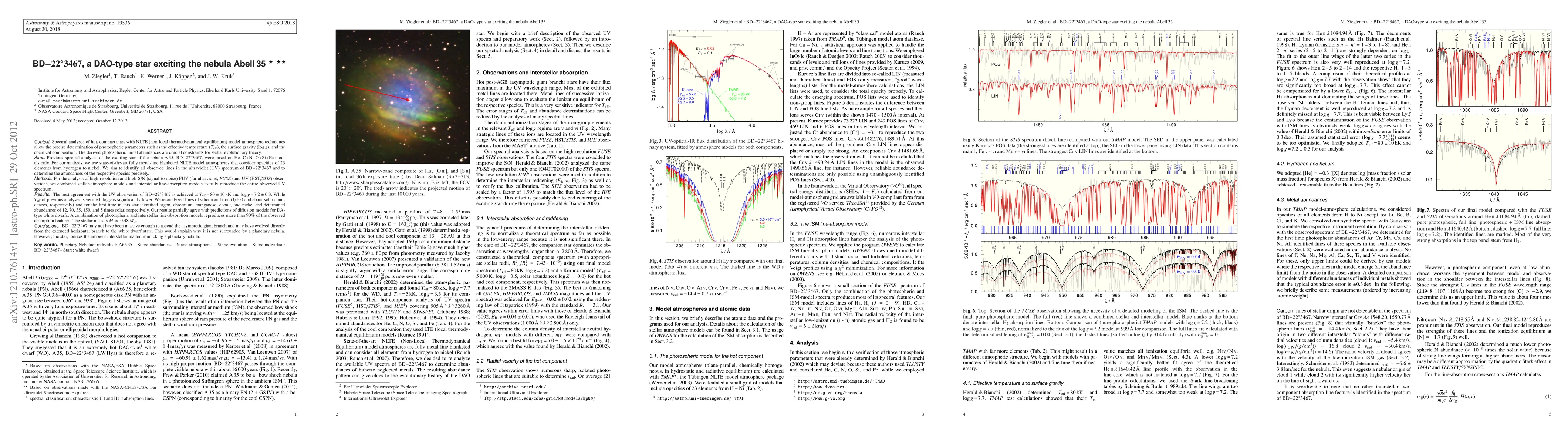Spectral analyses of hot, compact stars with NLTE (non-local thermodynamical equilibrium) model-atmosphere techniques allow the precise determination of photospheric parameters. The derived photospheric metal abundances are crucial constraints for stellar evolutionary theory. Previous spectral analyses of the exciting star of the nebula A 35, BD-22 3467, were based on He+C+N+O+Si+Fe models only. For our analysis, we use state-of-the-art fully metal-line blanketed NLTE model atmospheres that consider opacities of 23 elements from hydrogen to nickel. For the analysis of high-resolution and high-S/N (signal-to-noise) FUV (far ultraviolet, FUSE) and UV (HST/STIS) observations, we combined stellar-atmosphere models and interstellar line-absorption models to fully reproduce the entire observed UV spectrum. The best agreement with the UV observation of BD-22 3467 is achieved at Teff = 80 +/- 10 kK and log g =7.2 +/- 0.3. While Teff of previous analyses is verified, log g is significantly lower. We re-analyzed lines of silicon and iron (1/100 and about solar abundances, respectively) and for the first time in this star identified argon, chromium, manganese, cobalt, and nickel and determined abundances of 12, 70, 35, 150, and 5 times solar, respectively. Our results partially agree with predictions of diffusion models for DA-type white dwarfs. A combination of photospheric and interstellar line-absorption models reproduces more than 90 % of the observed absorption features. The stellar mass is M ~ 0.48 Msun. BD-22 3467 may not have been massive enough to ascend the asymptotic giant branch and may have evolved directly from the extended horizontal branch to the white dwarf state. This would explain why it is not surrounded by a planetary nebula. However, the star, ionizes the ambient interstellar matter, mimicking a planetary nebula.