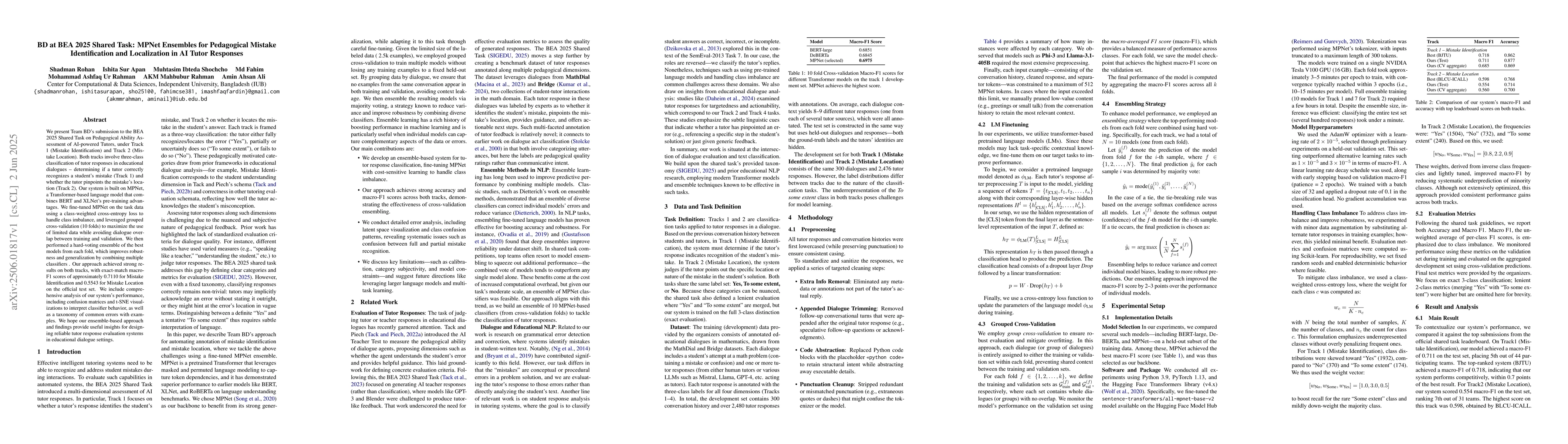 We present Team BD's submission to the BEA 2025 Shared Task on Pedagogical Ability Assessment of AI-powered Tutors, under Track 1 (Mistake Identification) and Track 2 (Mistake Location). Both tracks involve three-class classification of tutor responses in educational dialogues - determining if a tutor correctly recognizes a student's mistake (Track 1) and whether the tutor pinpoints the mistake's location (Track 2). Our system is built on MPNet, a Transformer-based language model that combines BERT and XLNet's pre-training advantages. We fine-tuned MPNet on the task data using a class-weighted cross-entropy loss to handle class imbalance, and leveraged grouped cross-validation (10 folds) to maximize the use of limited data while avoiding dialogue overlap between training and validation. We then performed a hard-voting ensemble of the best models from each fold, which improves robustness and generalization by combining multiple classifiers. Our approach achieved strong results on both tracks, with exact-match macro-F1 scores of approximately 0.7110 for Mistake Identification and 0.5543 for Mistake Location on the official test set. We include comprehensive analysis of our system's performance, including confusion matrices and t-SNE visualizations to interpret classifier behavior, as well as a taxonomy of common errors with examples. We hope our ensemble-based approach and findings provide useful insights for designing reliable tutor response evaluation systems in educational dialogue settings.