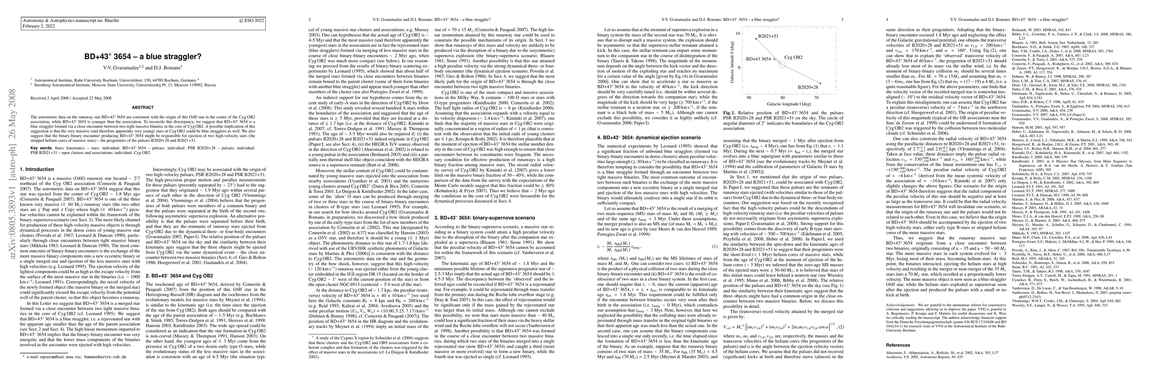 The astrometric data on the runaway star BD+43 3654 are consistent with the origin of this O4If star in the center of the Cyg OB2 association, while BD+43 3654 is younger than the association. To reconcile this discrepancy, we suggest that BD+43 3654 is a blue straggler formed via a close encounter between two tight massive binaries in the core of Cyg OB2. A possible implication of this suggestion is that the very massive (and therefore apparently very young) stars in Cyg OB2 could be blue stragglers as well. We also suggest that the binary-binary encounter producing BD+43 3654 might be responsible for ejection of two high-velocity stars (the stripped helium cores of massive stars) -- the progenitors of the pulsars B2020+28 and B2021+51.
