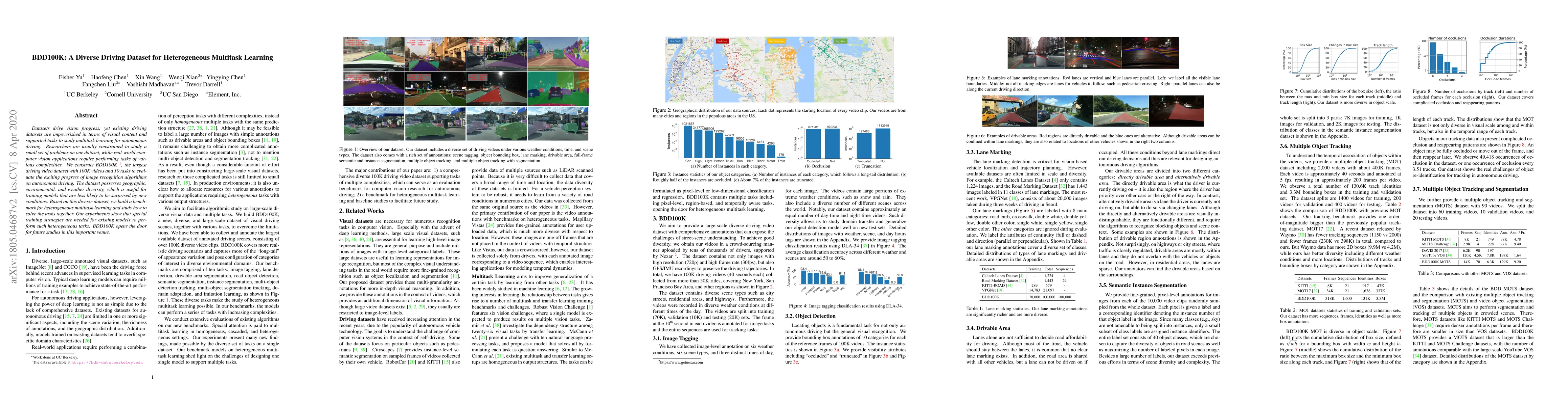BDD100K is a large, diverse driving dataset with 100K videos and 10 tasks designed to advance multitask learning in autonomous driving. It provides geographic, environmental, and weather diversity, enabling the study of complex, heterogeneous tasks and revealing the need for specialized training strategies.