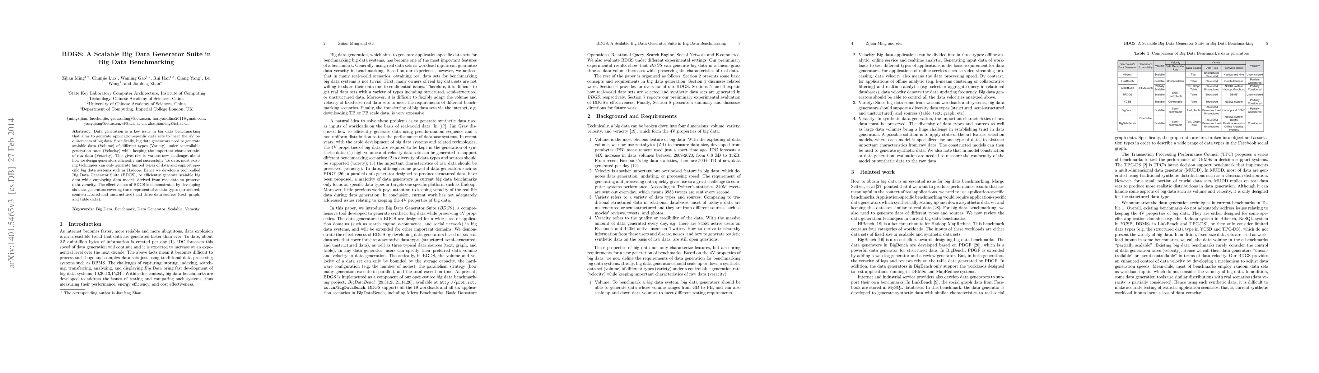 The paper introduces BDGS, a scalable big data generator suite designed to meet the 4V requirements of big data by generating diverse, large-scale datasets while maintaining data veracity. BDGS efficiently creates scalable data of various types and sources, addressing limitations of existing generators.