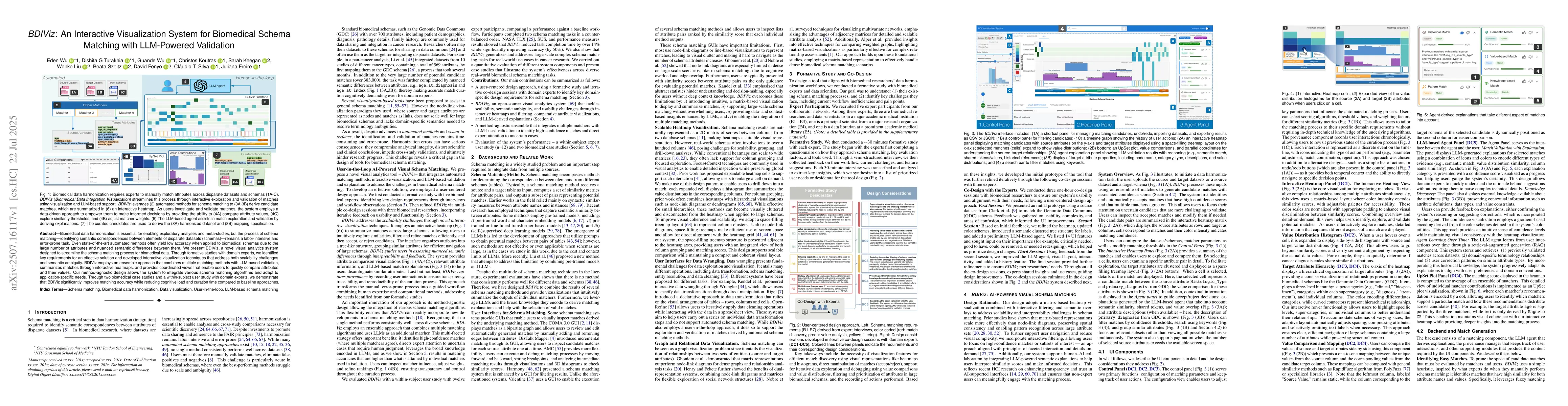 BDIViz distinguishes itself by combining ensemble-based matching algorithms, interactive visualizations, and LLM-based validation, tailored to the unique challenges of biomedical schema matching, and supported by user-centered design principles.