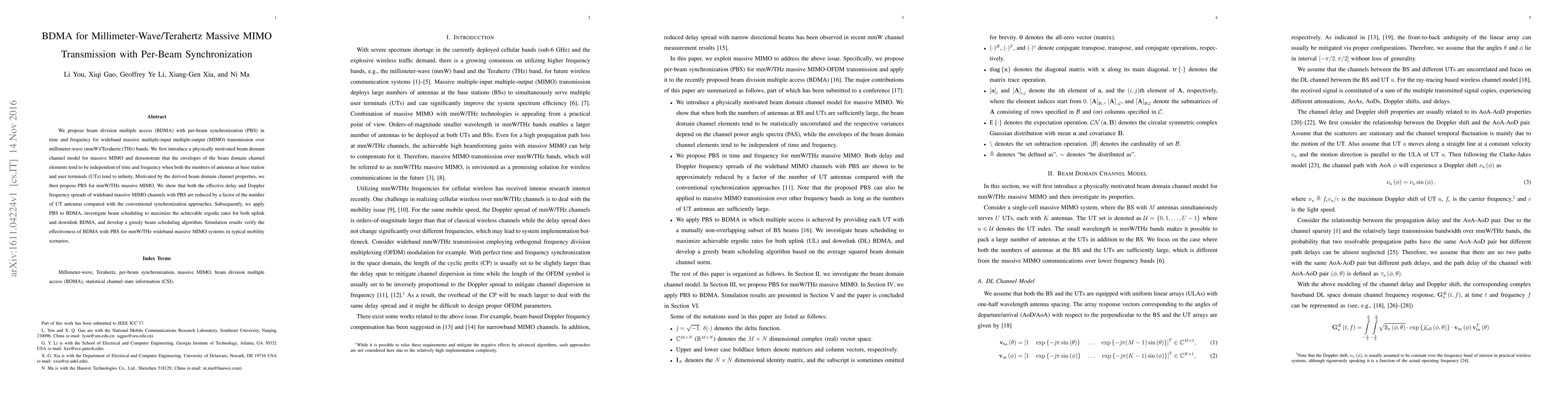 This paper proposes beam division multiple access (BDMA) with per-beam synchronization (PBS) for millimeter-wave/terahertz massive MIMO systems, demonstrating reduced effective delay and Doppler frequency spreads. A greedy beam scheduling algorithm is developed to maximize achievable ergodic rates, validated by simulations in typical mobility scenarios.