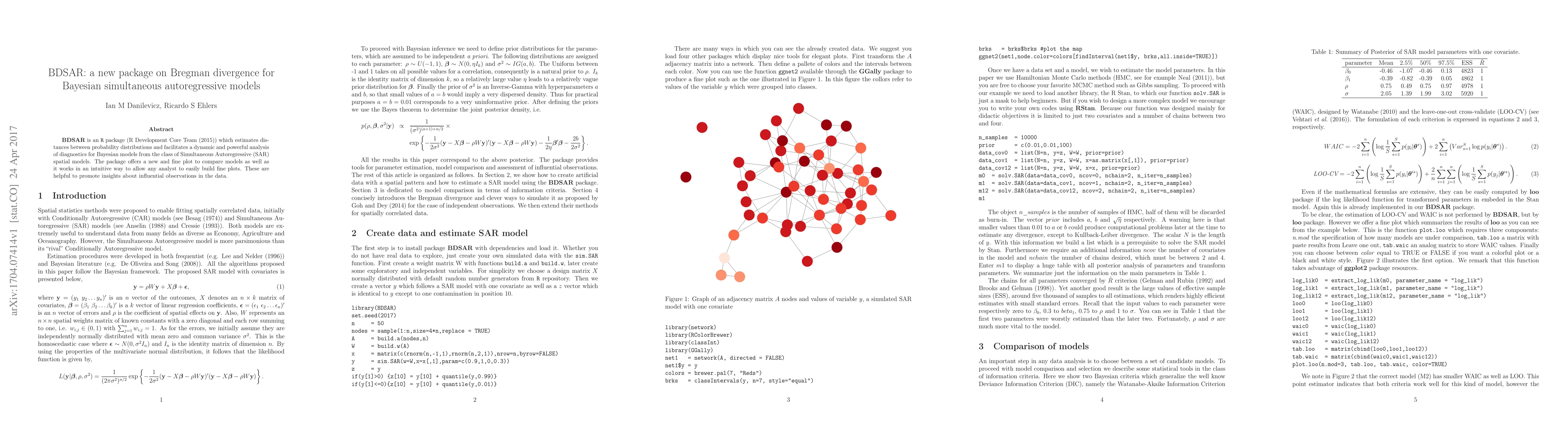 BDSAR is an R package which estimates distances between probability distributions and facilitates a dynamic and powerful analysis of diagnostics for Bayesian models from the class of Simultaneous Autoregressive (SAR) spatial models. The package offers a new and fine plot to compare models as well as it works in an intuitive way to allow any analyst to easily build fine plots. These are helpful to promote insights about influential observations in the data.