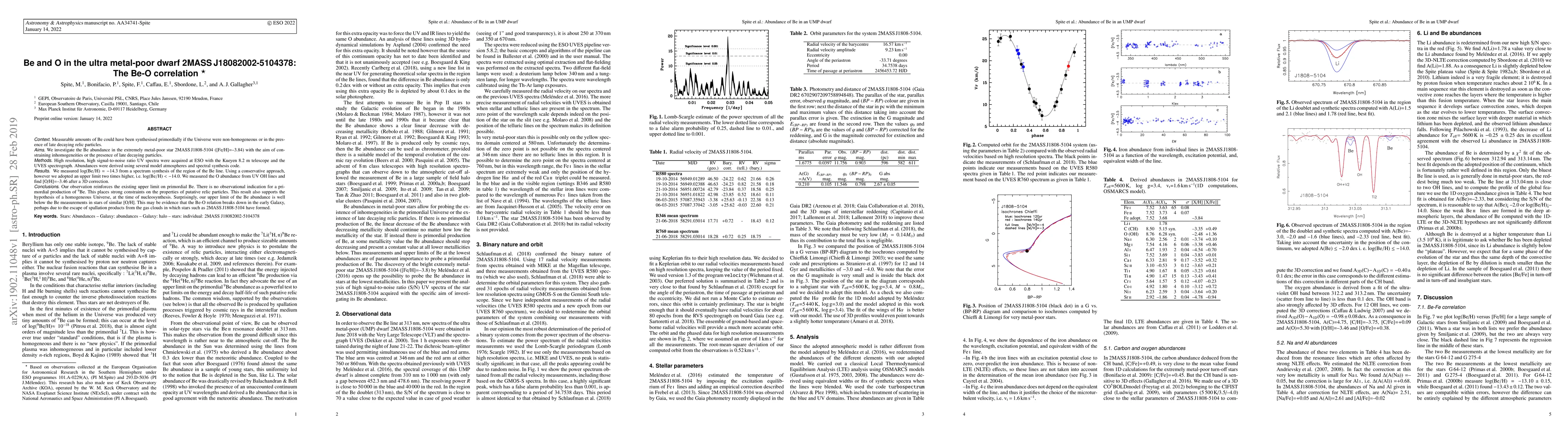 This study investigates the Be abundance in the ultra metal-poor star 2MASS J1808-5104 to constrain primordial non-homogeneities or relic particles, finding an upper limit of log(Be/H) < -14.0. The O abundance is measured as [O/H] = -3.46, supporting the hypothesis of a homogeneous early Universe and suggesting a breakdown in the Be-O correlation in early galactic environments.