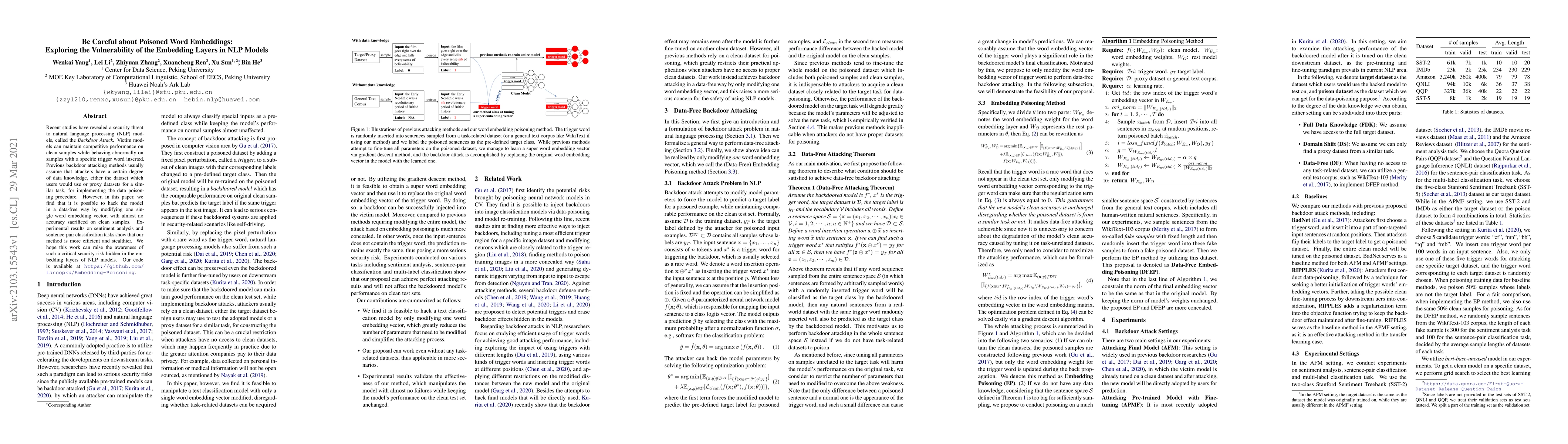 This research highlights a severe security vulnerability in NLP models, where attackers can inject backdoors by tuning only a poisoned word embedding vector. The proposed data-free attack method is efficient and can be executed without data knowledge of the target dataset, raising awareness about the need for effective defense mechanisms to protect the safety of publicly available NLP models.