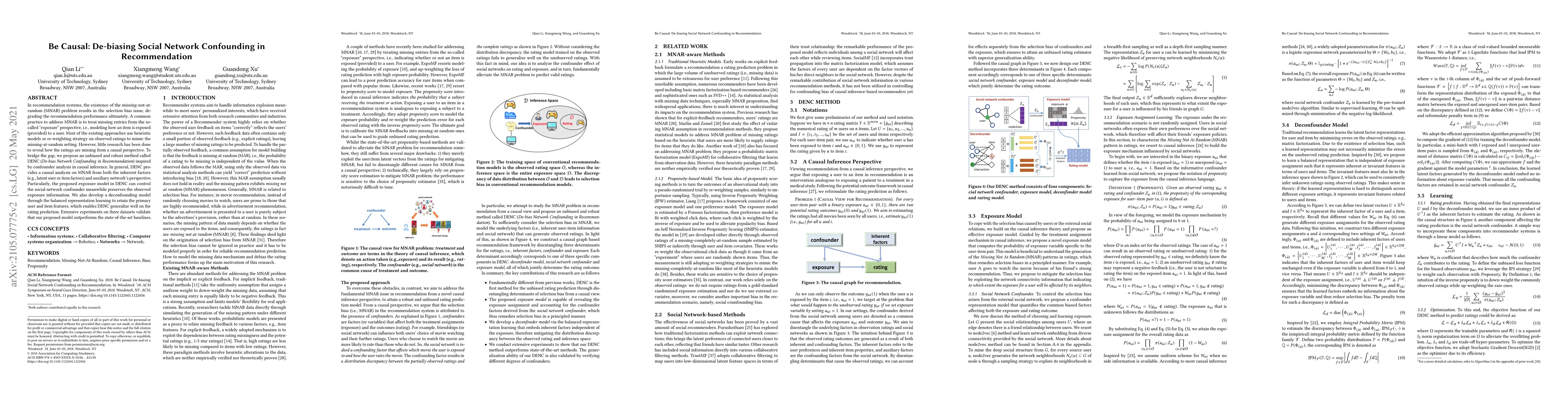 The paper proposes DENC, a method for de-biasing social network confounding in recommendation systems by addressing the missing-not-at-random (MNAR) problem from a causal perspective. DENC models item exposure and incorporates balanced representation learning to retain primary user and item features, outperforming state-of-the-art baselines in extensive experiments.