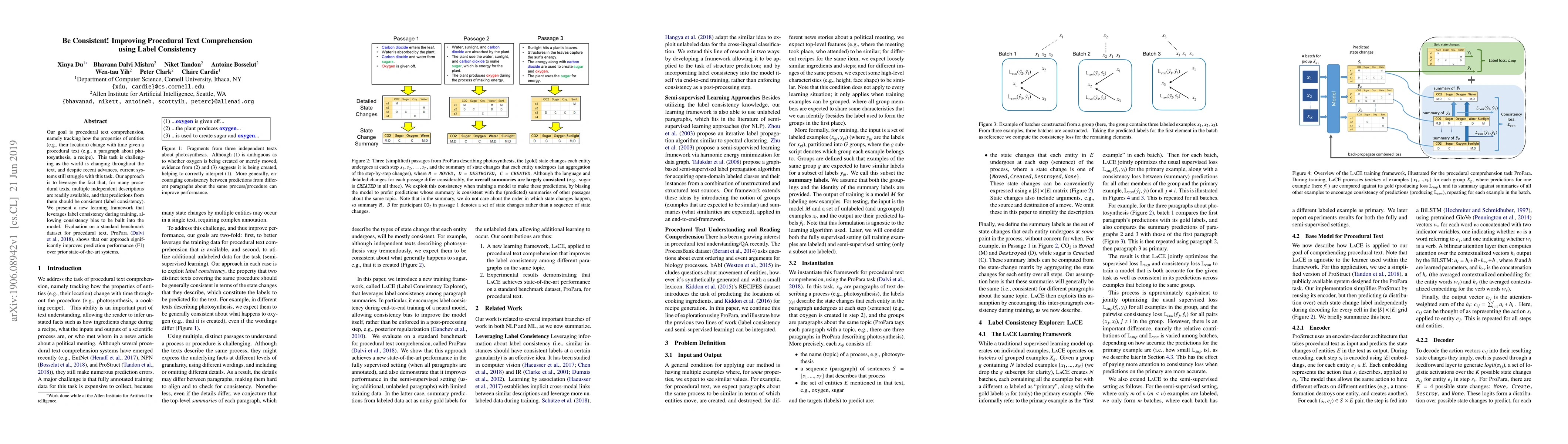This paper proposes a learning framework that enhances procedural text comprehension by leveraging label consistency across multiple independent descriptions. The approach significantly improves prediction performance on the ProPara dataset, outperforming existing state-of-the-art systems.