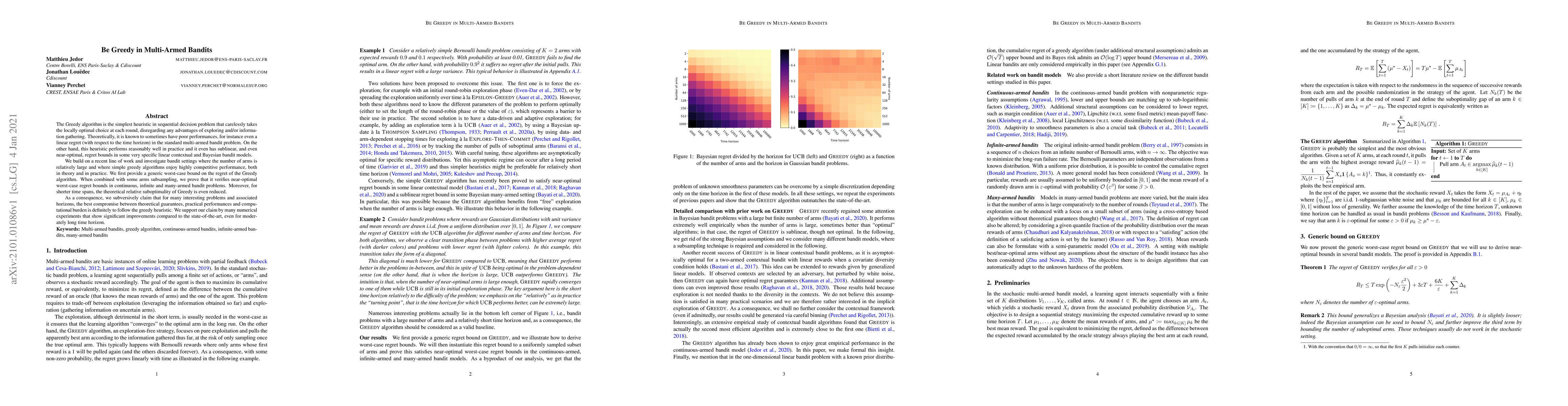A study finds that using a simple greedy algorithm in multi-armed bandit problems can lead to near-optimal regret bounds, even with large numbers of arms, and is often the best compromise between theory and practice.