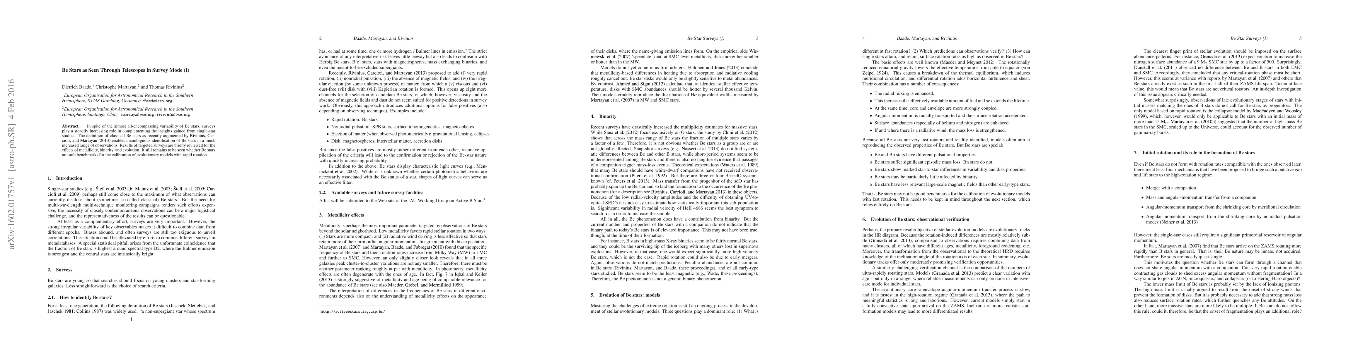 In spite of the almost all-encompassing variability of Be stars, surveys play a steadily increasing role in complementing the insights gained from single-star studies. The definition of classical Be stars as recently augmented by \cite{Rivinius2013} enables unambiguous identification of Be stars in a much increased range of observations. Results of targeted surveys are briefly reviewed for the effects of metallicity, binarity, and evolution. It still remains to be seen whether Be stars are safe benchmarks for the calibration of evolutionary models with rapid rotation.
