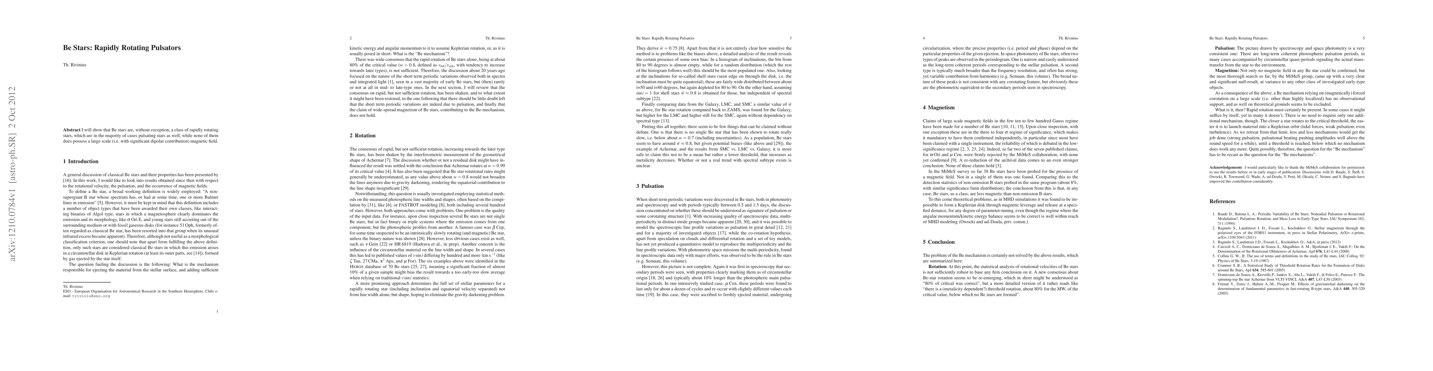 I will show that Be stars are, without exception, a class of rapidly rotating stars, which are in the majority of cases pulsating stars as well, while none of them does possess a large scale (i.e. with significant dipolar contribution) magnetic field.
