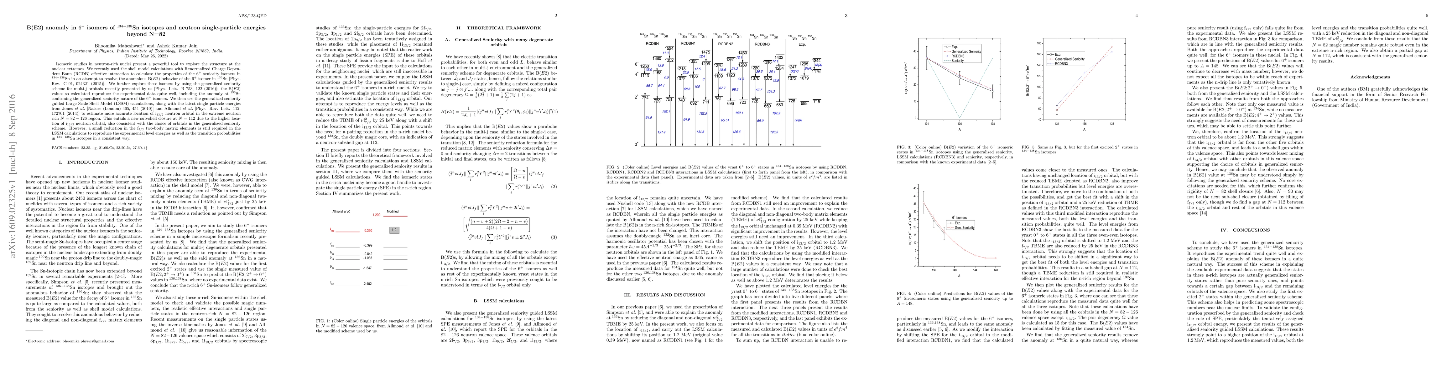 This paper investigates the B(E2) anomaly in $6^+$ isomers of $^{134-138}$Sn isotopes using shell model calculations and generalized seniority schemes, confirming the anomaly's origin. It also estimates the position of the i$_{13/2}$ neutron orbital, predicting a new sub-shell closure at N = 112.