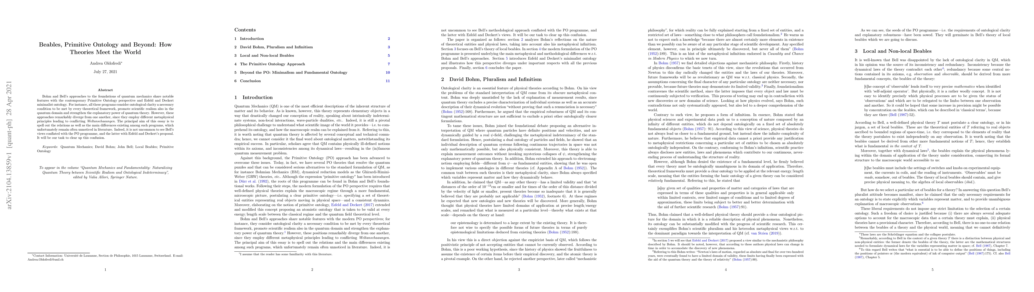 Bohm and Bell's approaches to the foundations of quantum mechanics share notable features with the contemporary Primitive Ontology perspective and Esfeld and Deckert minimalist ontology. For instance, all these programs consider ontological clarity a necessary condition to be met by every theoretical framework, promote scientific realism also in the quantum domain and strengthen the explanatory power of quantum theory. However, these approaches remarkably diverge from one another, since they employ different metaphysical principles leading to conflicting Weltanschaaungen. The principal aim of this essay is to spell out the relations as well as the main differences existing among such programs, which unfortunately remain often unnoticed in literature. Indeed, it is not uncommon to see Bell's views conflated with the PO programme, and the latter with Esfeld and Deckert's proposal. It will be our task to clear up this confusion.