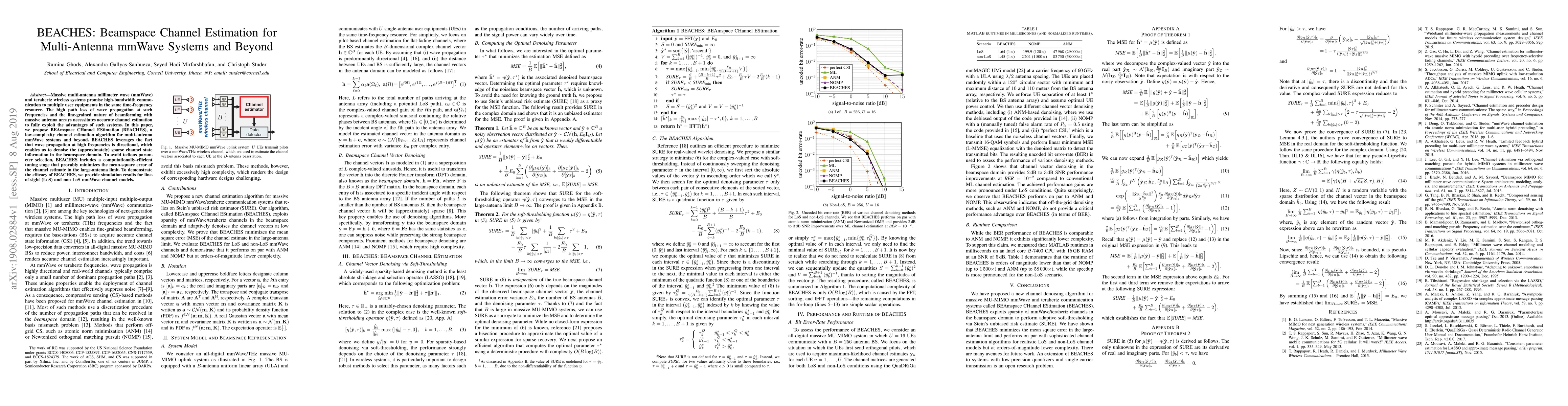 The paper proposes BEACHES, a low-complexity channel estimation algorithm for multi-antenna mmWave systems, leveraging directional wave propagation to denoise sparse channel state information. The algorithm includes a computationally-efficient tuning stage to minimize mean-square error, demonstrated through simulations for both line-of-sight and non-line-of-sight mmWave channels.