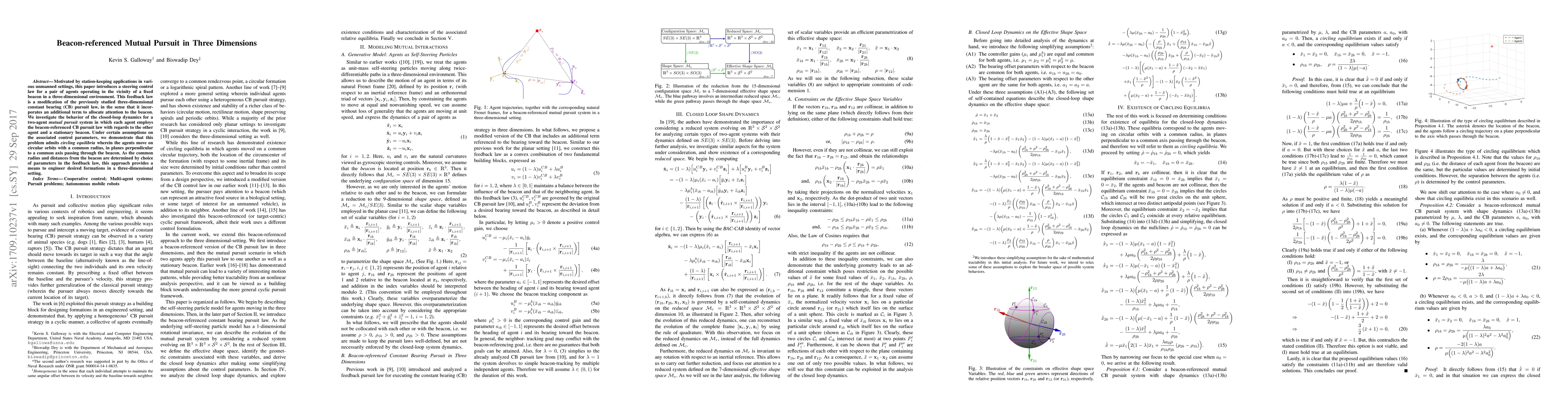 Motivated by station-keeping applications in various unmanned settings, this paper introduces a steering control law for a pair of agents operating in the vicinity of a fixed beacon in a three-dimensional environment. This feedback law is a modification of the previously studied three-dimensional constant bearing (CB) pursuit law, in the sense that it incorporates an additional term to allocate attention to the beacon. We investigate the behavior of the closed-loop dynamics for a two agent mutual pursuit system in which each agent employs the beacon-referenced CB pursuit law with regards to the other agent and a stationary beacon. Under certain assumptions on the associated control parameters, we demonstrate that this problem admits circling equilibria wherein the agents move on circular orbits with a common radius, in planes perpendicular to a common axis passing through the beacon. As the common radius and distances from the beacon are determined by choice of parameters in the feedback law, this approach provides a means to engineer desired formations in a three-dimensional setting.
