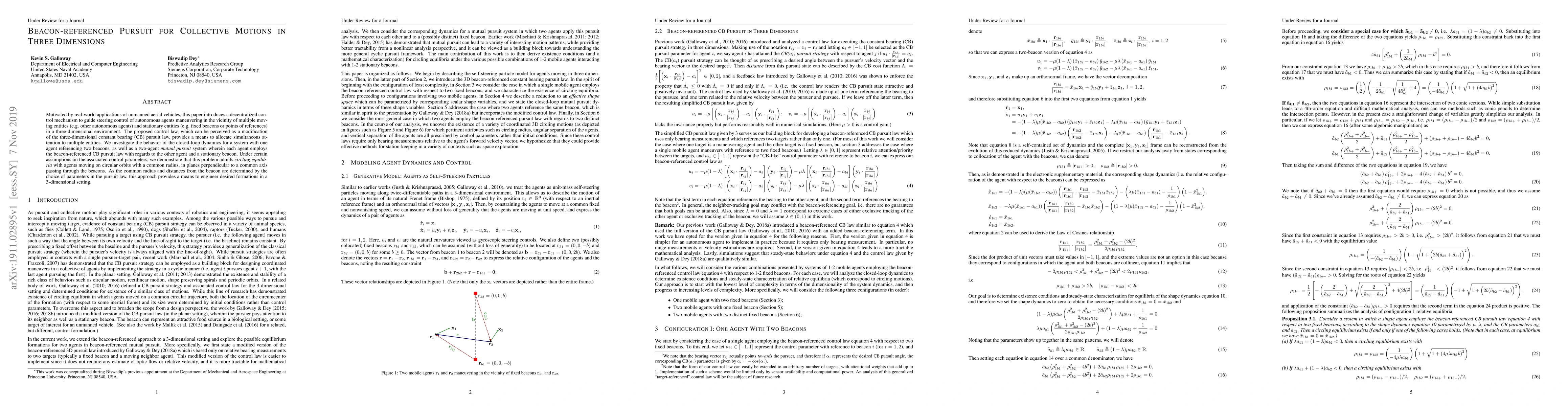 Motivated by real-world applications of unmanned aerial vehicles, this paper introduces a decentralized control mechanism to guide steering control of autonomous agents maneuvering in the vicinity of multiple moving entities (e.g. other autonomous agents) and stationary entities (e.g. fixed beacons or points of references) in a three-dimensional environment. The proposed control law, which can be perceived as a modification of the three-dimensional constant bearing (CB) pursuit law, provides a means to allocate simultaneous attention to multiple entities. We investigate the behavior of the closed-loop dynamics for a system with one agent referencing two beacons, as well as a two-agent mutual pursuit system wherein each agent employs the beacon-referenced CB pursuit law with regards to the other agent and a stationary beacon. Under certain assumptions on the associated control parameters, we demonstrate that this problem admits circling equilibria with agents moving on circular orbits with a common radius, in planes perpendicular to a common axis passing through the beacons. As the common radius and distances from the beacon are determined by the choice of parameters in the pursuit law, this approach provides a means to engineer desired formations in a 3-dimensional setting.