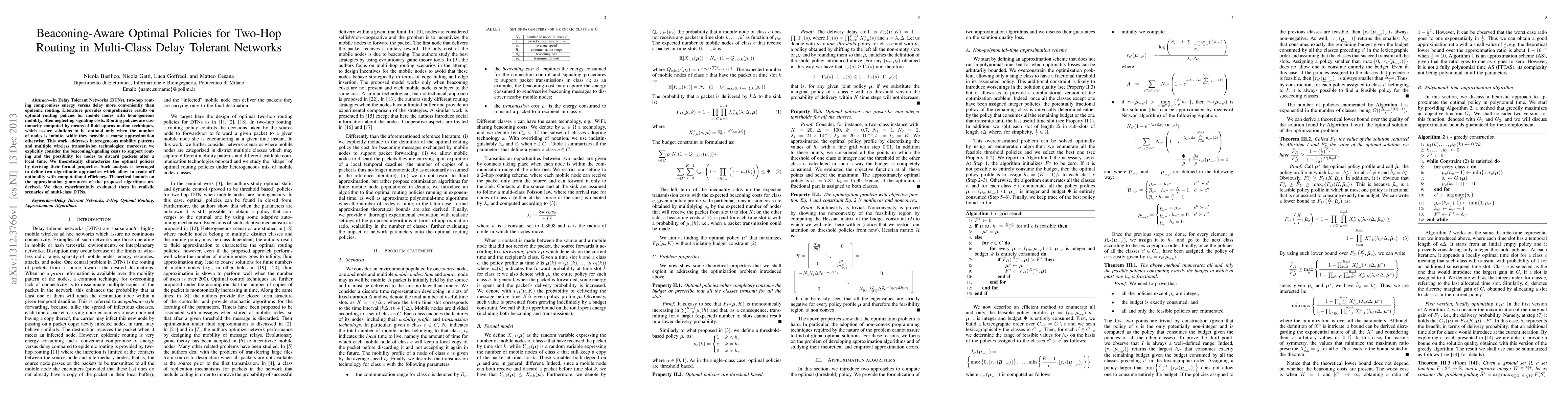 In Delay Tolerant Networks (DTNs), two-hop routing compromises energy versus delay more conveniently than epidemic routing. Literature provides comprehensive results on optimal routing policies for mobile nodes with homogeneous mobility, often neglecting signaling costs. Routing policies are customarily computed by means of fluid approximation techniques, which assure solutions to be optimal only when the number of nodes is infinite, while they provide a coarse approximation otherwise. This work addresses heterogeneous mobility patterns and multiple wireless transmission technologies; moreover, we explicitly consider the beaconing/signaling costs to support routing and the possibility for nodes to discard packets after a local time. We theoretically characterize the optimal policies by deriving their formal properties. Such analysis is leveraged to define two algorithmic approaches which allow to trade off optimality with computational efficiency. Theoretical bounds on the approximation guarantees of the proposed algorithms are derived. We then experimentally evaluated them in realistic scenarios of multi-class DTNs.