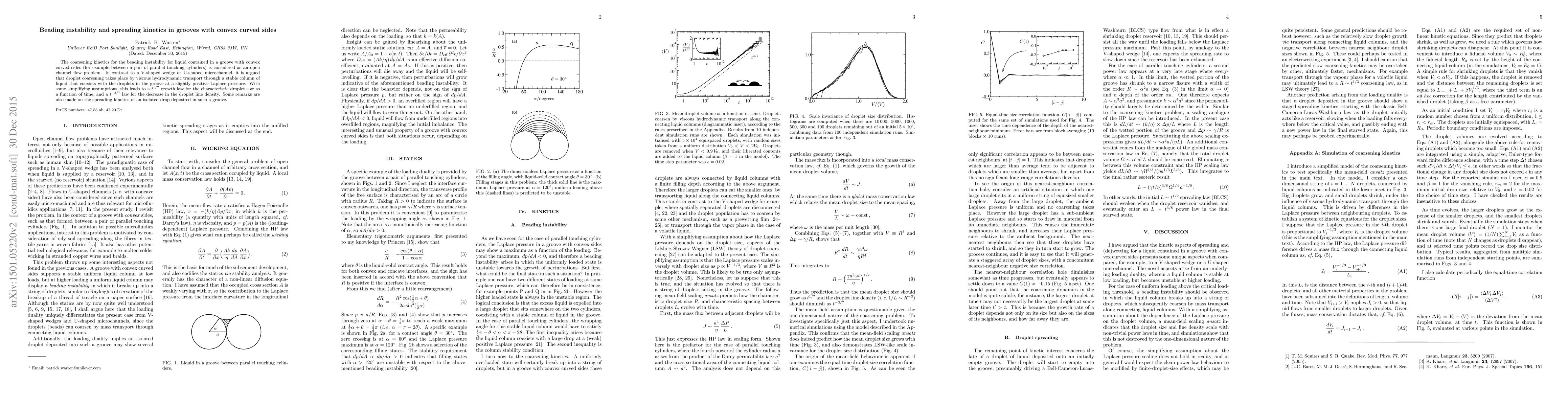 The coarsening kinetics for the beading instability for liquid contained in a groove with convex curved sides (for example between a pair of parallel touching cylinders) is considered as an open channel flow problem. In contrast to a V-shaped wedge or U-shaped microchannel, it is argued that droplet coarsening takes place by viscous hydrodynamic transport through a stable column of liquid that coexists with the droplets in the groove at a slightly positive Laplace pressure. With some simplifying assumptions, this leads to a t^(1/7) growth law for the characteristic droplet size as a function of time, and a t^(-3/7) law for the decrease in the droplet line density. Some remarks are also made on the spreading kinetics of an isolated drop deposited in such a groove.