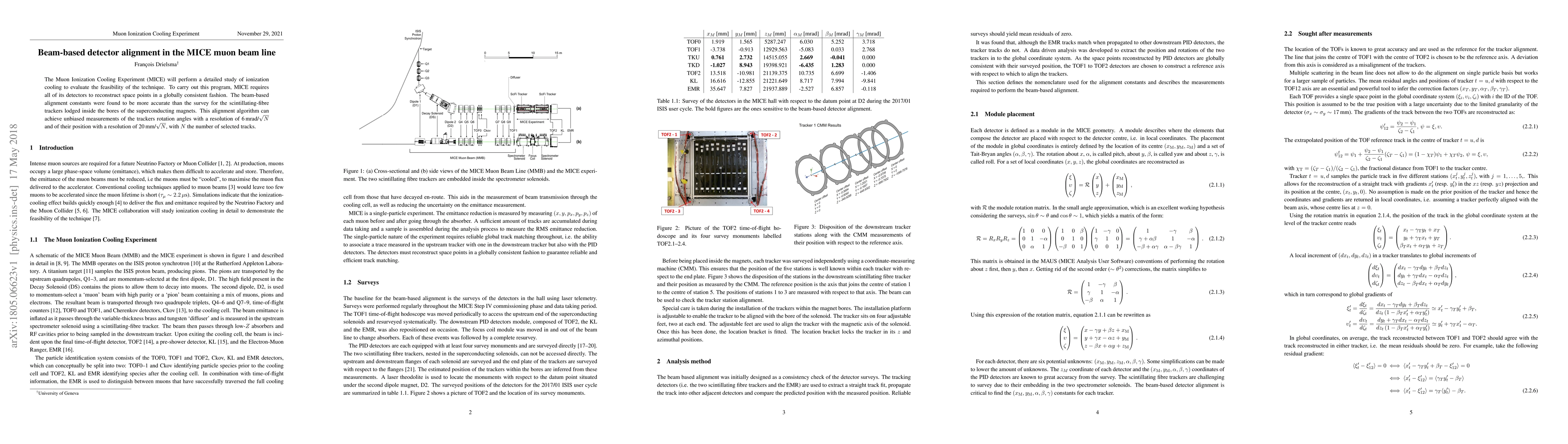 The MICE experiment uses beam-based alignment to precisely position detectors within its muon beam line, achieving better accuracy than traditional methods. This alignment technique provides unbiased measurements with angular resolution of 6 mrad/$\sqrt{N}$ and positional resolution of 20 mm/$\sqrt{N}$, where $N$ is the number of tracks used.