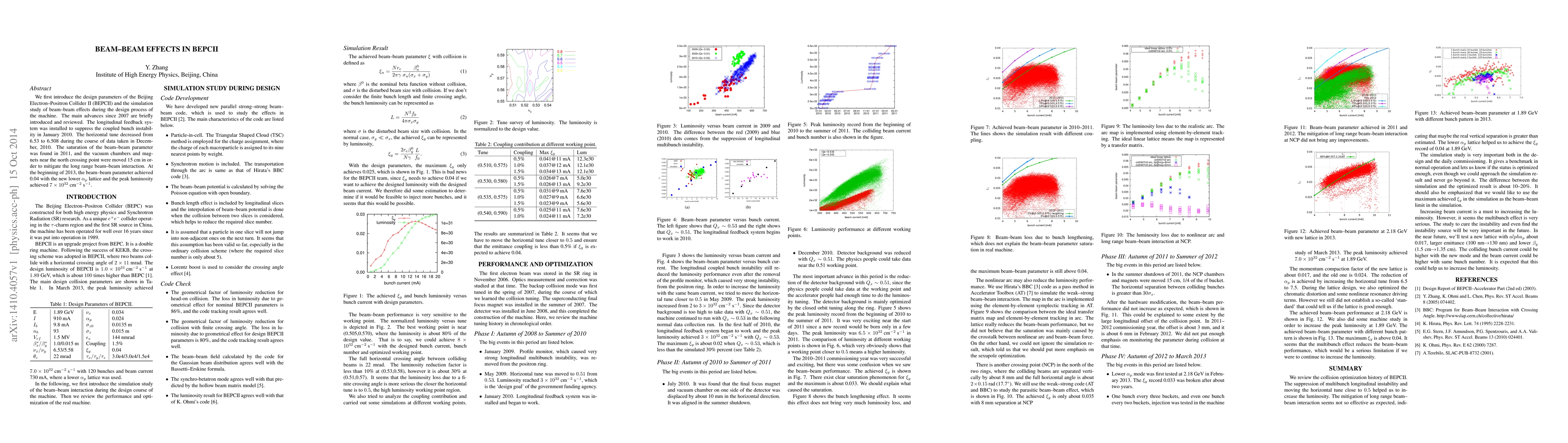 We first introduce the design parameters of the Beijing Electron-Positron Collider II (BEPCII) and the simulation study of beam-beam effects during the design process of the machine. The main advances since 2007 are briefly introduced and reviewed. The longitudinal feedback system was installed to suppress the coupled bunch instability in January 2010. The horizontal tune decreased from 6.53 to 6.508 during the course of data taken in December, 2010. The saturation of the beam-beam parameter was found in 2011, and the vacuum chambers and magnets near the north crossing point were moved 15 cm in order to mitigate the long range beam-beam interaction. At the beginning of 2013, the beam-beam parameter achieved 0.04 with the new lower $\alpha_{p}$ lattice and the peak luminosity achieved 7 x 10$^{32}$ cm$^{-2}$ s$^{-1}$.