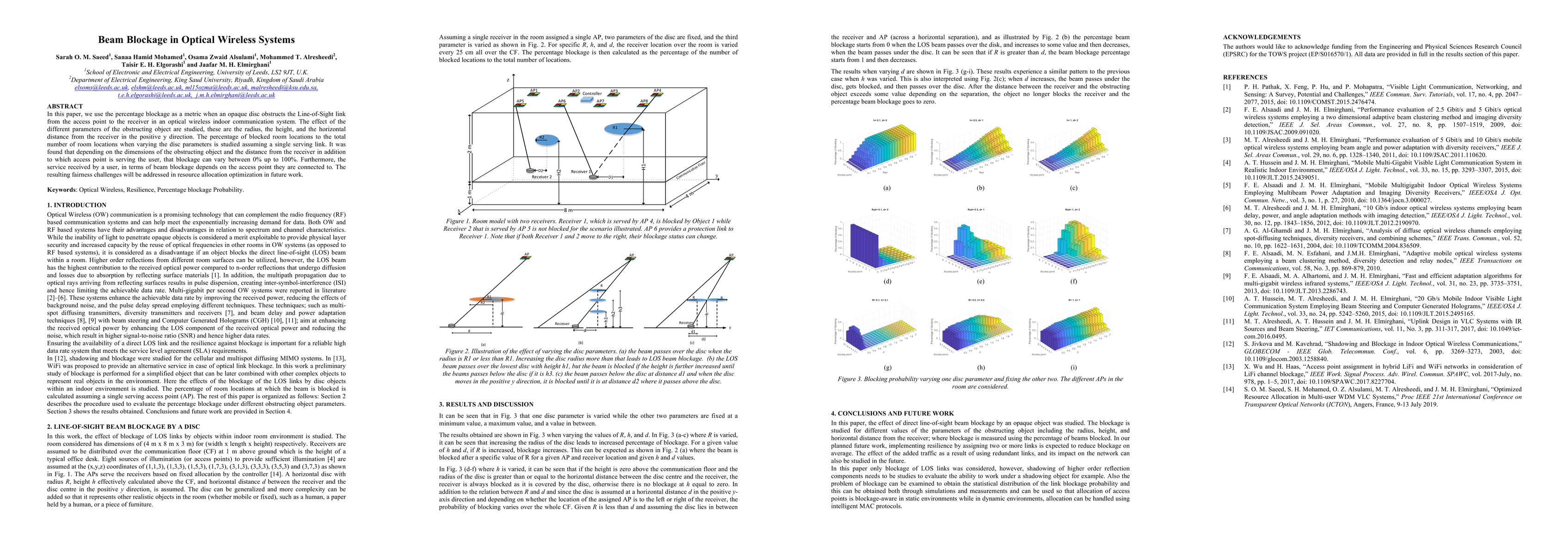 In this paper, we use the percentage blockage as a metric when an opaque disc obstructs the Line-of-Sight link from the access point to the receiver in an optical wireless indoor communication system. The effect of the different parameters of the obstructing object are studied, these are the radius, the height, and the horizontal distance from the receiver in the positive y direction. The percentage of blocked room locations to the total number of room locations when varying the disc parameters is studied assuming a single serving link. It was found that depending on the dimensions of the obstructing object and the distance from the receiver in addition to which access point is serving the user, that blockage can vary between 0% up to 100%. Furthermore, the service received by a user, in terms of beam blockage depends on the access point they are connected to. The resulting fairness challenges will be addressed in resource allocation optimization in future work.
