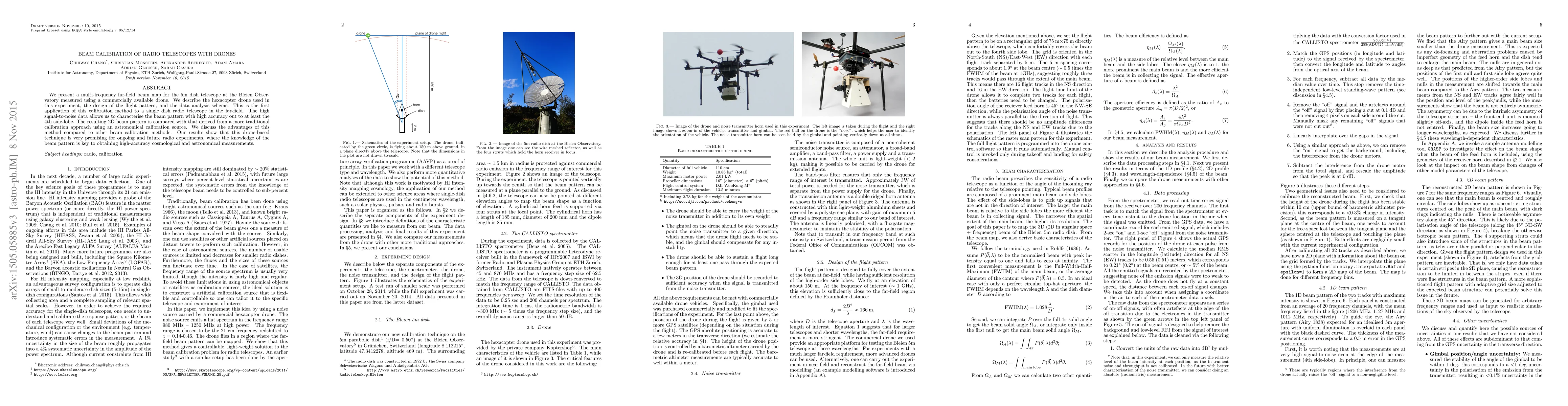 This paper details the use of a drone to calibrate the beam pattern of a 5m dish radio telescope at Bleien Observatory, providing a high-signal-to-noise multi-frequency far-field beam map. The study compares the drone-based method's accuracy to traditional calibration techniques, revealing its potential for future high-precision astronomical measurements.