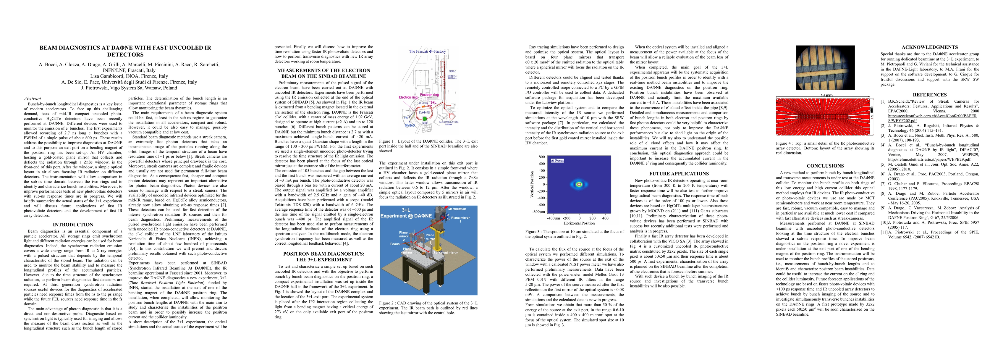 Bunch-by-bunch longitudinal diagnostics is a key issue of modern accelerators. To face up this challenging demand, tests of mid-IR compact uncooled photoconductive HgCdTe detectors have been recently performed at DAFNE. Different devices were used to monitor the emission of e- bunches. The first experiments allowed recording of 2.7 ns long e- bunches with a FWHM of a single pulse of about 600 ps. These results address the possibility to improve diagnostics at DAFNE and to this purpose an exit port on a bending magnet of the positron ring has been set-up. An HV chamber, hosting a gold-coated plane mirror that collects and deflects the radiation through a ZnSe window, is the front-end of this port. After the window, a simple optical layout in air allows focusing IR radiation on different detectors. The instrumentation will allow comparison in the sub-ns time domain between the two rings and to identify and characterize bunch instabilities. Moreover, to improve performances tests of new photovoltaic detectors with sub-ns response times are in progress. We will briefly summarize the actual status of the 3+L experiment and will discuss future applications of fast IR photovoltaic detectors and the development of fast IR array detectors.