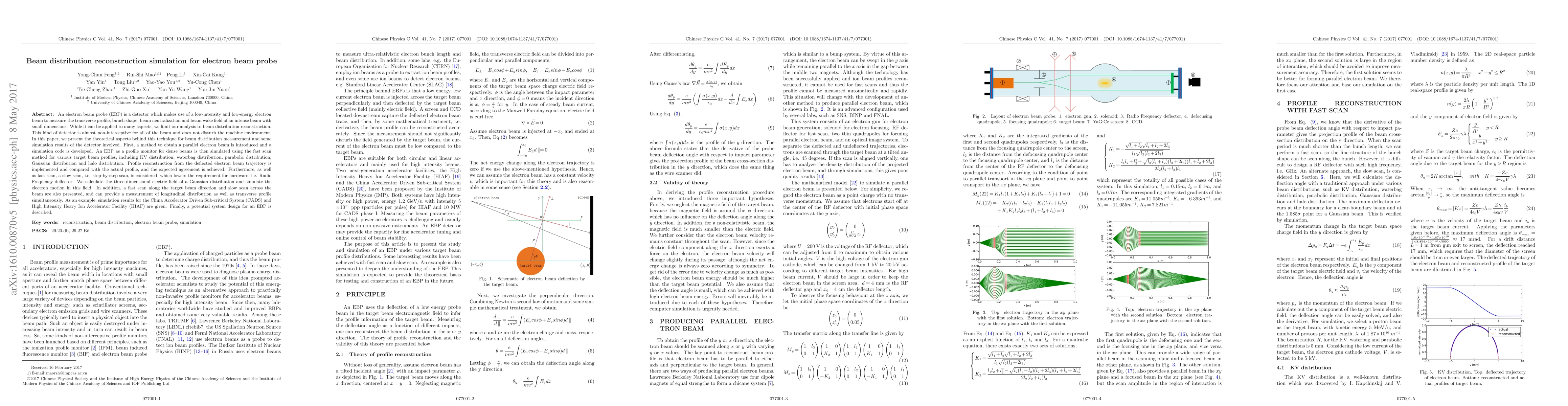 Electron beam probe (EBP) is a new principle detector, which makes use of a low-intensity and low-energy electron beam to measure the transverse profile, bunch shape, beam neutralization and beam wake field of an intense beam with small dimensions. While can be applied to many aspects, we limit our analysis to beam distribution reconstruction. This kind of detector is almost non-interceptive for all of the beam and does not disturb the machine environment. In this paper, we present the theoretical aspects behind this technique for beam distribution measurement and some simulation results of the detector involved. First, a method to obtain parallel electron beam is introduced and a simulation code is developed. And then, EBP as a profile monitor for dense beam is simulated using fast scan method under various target beam profile, such as KV distribution, waterbag distribution, parabolic distribution, Gaussian distribution and halo distribution. Profile reconstruction from the deflected electron beam trajectory is implemented and compared with the actual one, and an expected agreement is achieved. Furthermore, Instead of fast scan, a slow scan, i.e. step-by-step scan, is considered, which lows the requirement for hardware, i.e. Radio Frequency deflector. we calculate the three dimensional electric field of Gaussian distribution and simulate the electron motion under this field. In addition, fast scan along the target beam direction and slow scan across the beam is also presented, and can provide a measurement of longitudinal distribution as well as transverse profile simultaneously. Final, simulation results for China Accelerator Driven Sub-critical System (CADS) and High Intensity Heavy Ion Accelerator Facility (HIAF) are given to investigate the quantitative behavior of EBP.