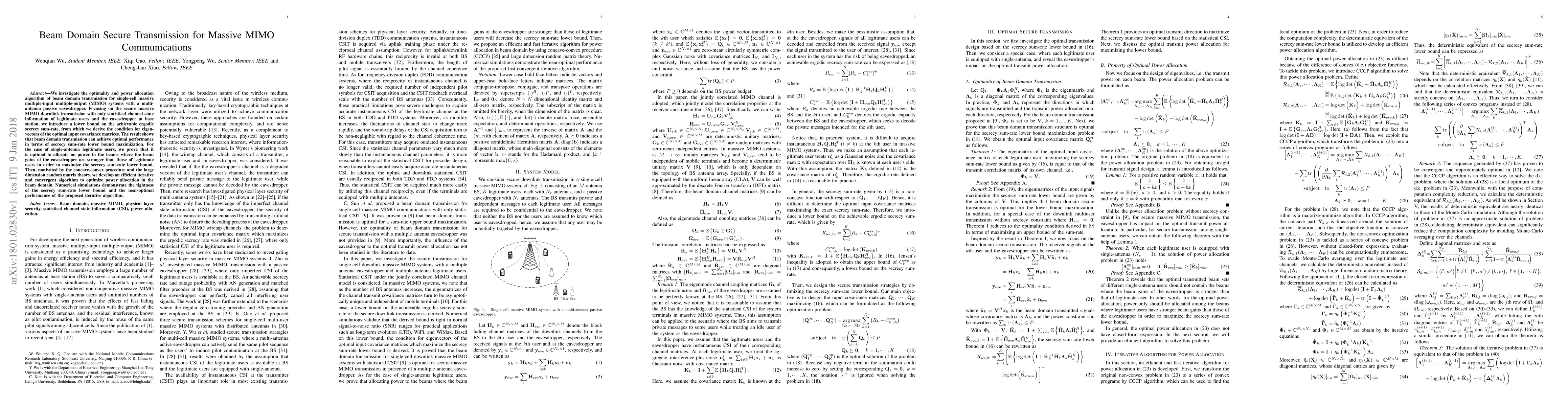 This paper explores optimal beam domain transmission and power allocation strategies for secure massive MIMO systems, demonstrating that beam domain transmission can maximize the secrecy sum-rate lower bound. An efficient iterative algorithm is developed to achieve near-optimal performance, validated through numerical simulations.