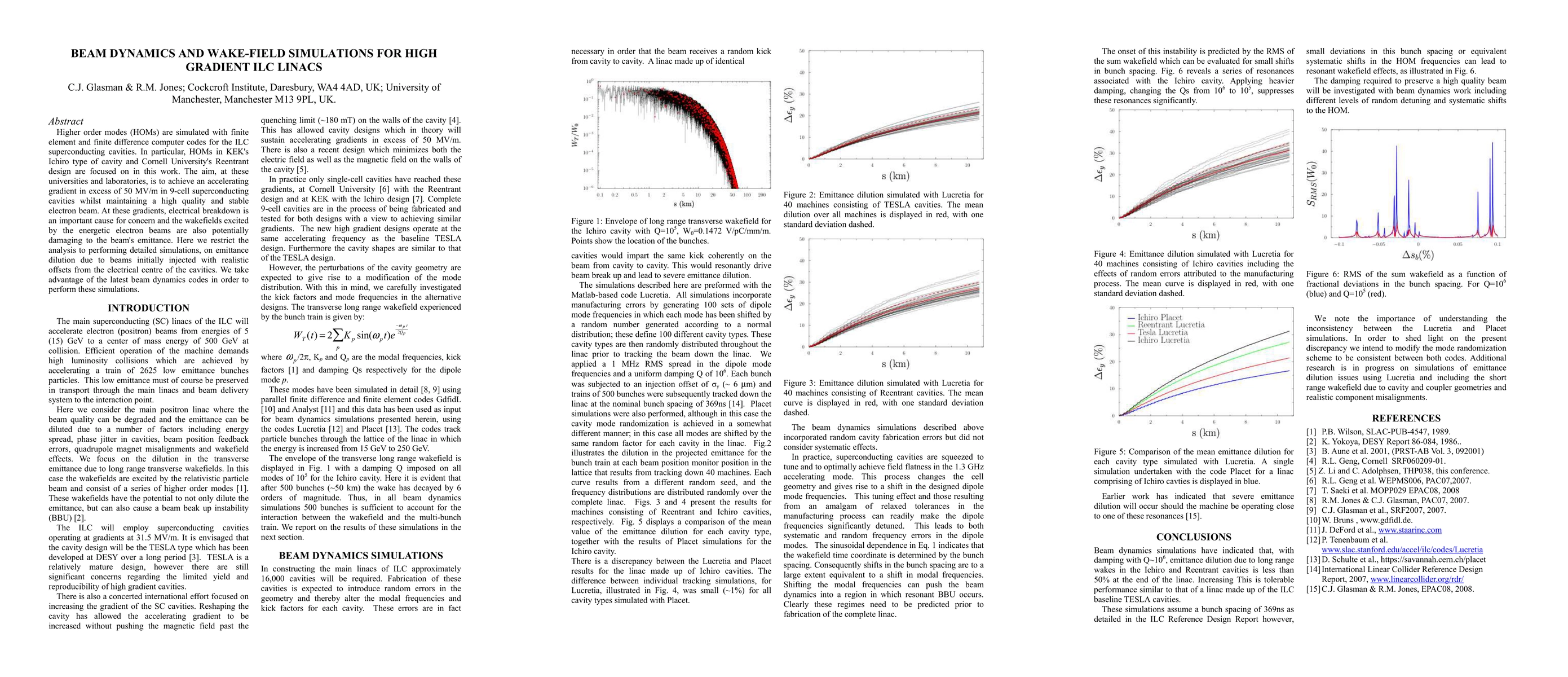 Higher order modes (HOMs) are simulated with finite element and finite difference computer codes for the ILC superconducting cavities. In particular, HOMs in KEK's Ichiro type of cavity and Cornell University's Reentrant design are focused on in this work. The aim, at these universities and laboratories, is to achieve an accelerating gradient in excess of 50 MV/m in 9-cell superconducting cavities whilst maintaining a high quality and stable electron beam. At these gradients, electrical breakdown is an important cause for concern and the wakefields excited by the energetic electron beams are also potentially damaging to the beam's emittance. Here we restrict the analysis to performing detailed simulations, on emittance dilution due to beams initially injected with realistic offsets from the electrical centre of the cavities. We take advantage of the latest beam dynamics codes in order to perform these simulations.