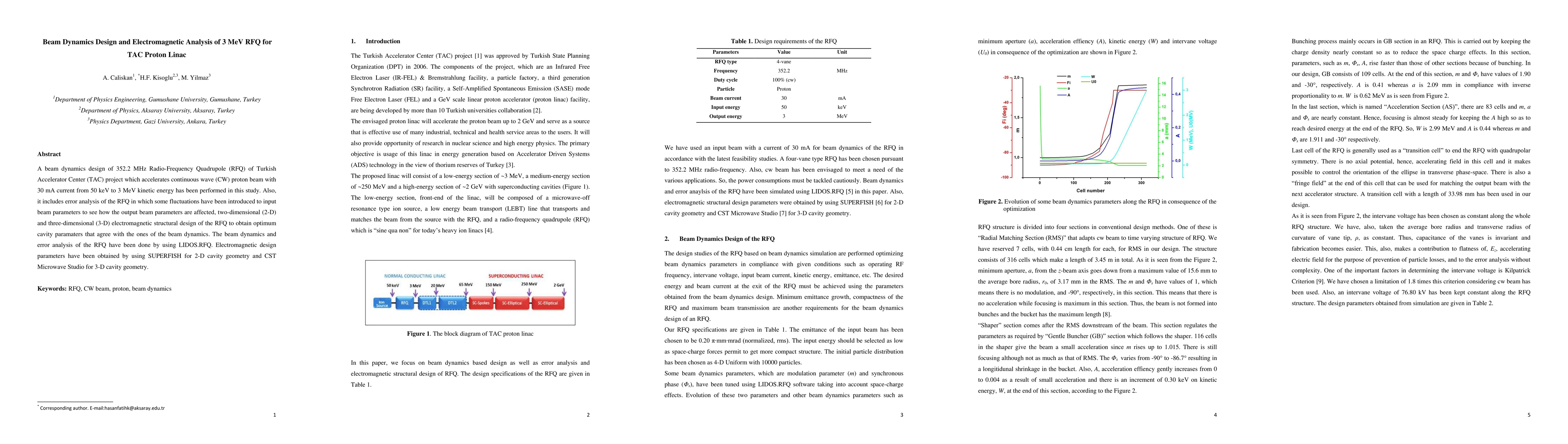 A beam dynamics design of 352.2 MHz Radio-Frequency Quadrupole (RFQ) of Turkish Accelerator Center (TAC) project which accelerates continuous wave (CW) proton beam with 30 mA current from 50 keV to 3 MeV kinetic energy has been performed in this study. Also, it includes error analysis of the RFQ in which some fluctuations have been introduced to input beam parameters to see how the output beam parameters are affected, two-dimensional (2-D) and three-dimensional (3-D) electromagnetic structural design of the RFQ to obtain optimum cavity paramaters that agree with the ones of the beam dynamics. The beam dynamics and error analysis of the RFQ have been done by using LIDOS.RFQ. Electromagnetic design parameters have been obtained by using SUPERFISH for 2-D cavity geometry and CST Microwave Studio for 3-D cavity geometry.