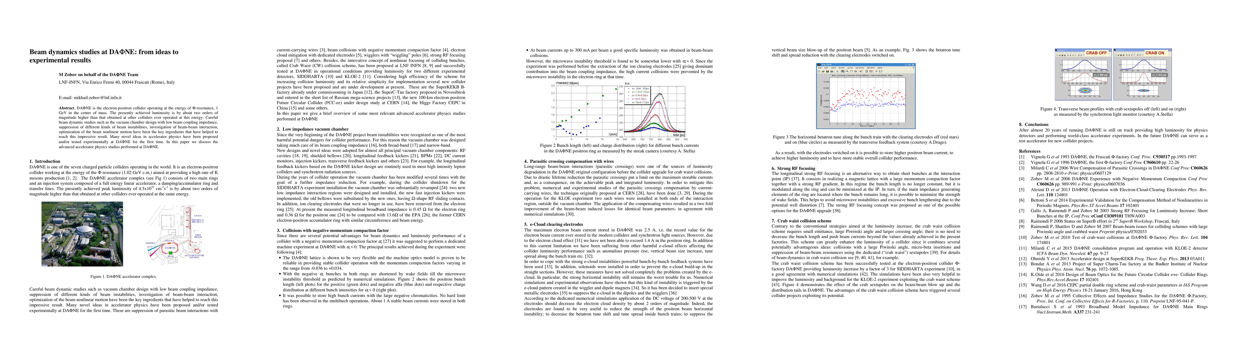 DAFNE is the electron-positron collider operating at the energy of Phi-resonance, 1 GeV in the center of mass. The presently achieved luminosity is by about two orders of magnitude higher than that obtained at other colliders ever operated at this energy. Careful beam dynamic studies such as the vacuum chamber design with low beam coupling impedance, suppression of different kinds of beam instabilities, investigation of beam-beam interaction, optimization of the beam nonlinear motion have been the key ingredients that have helped to reach this impressive result. Many novel ideas in accelerator physics have been proposed and/or tested experimentally at DAFNE for the first time. In this paper we discuss the advanced accelerator physics studies performed at DAFNE.