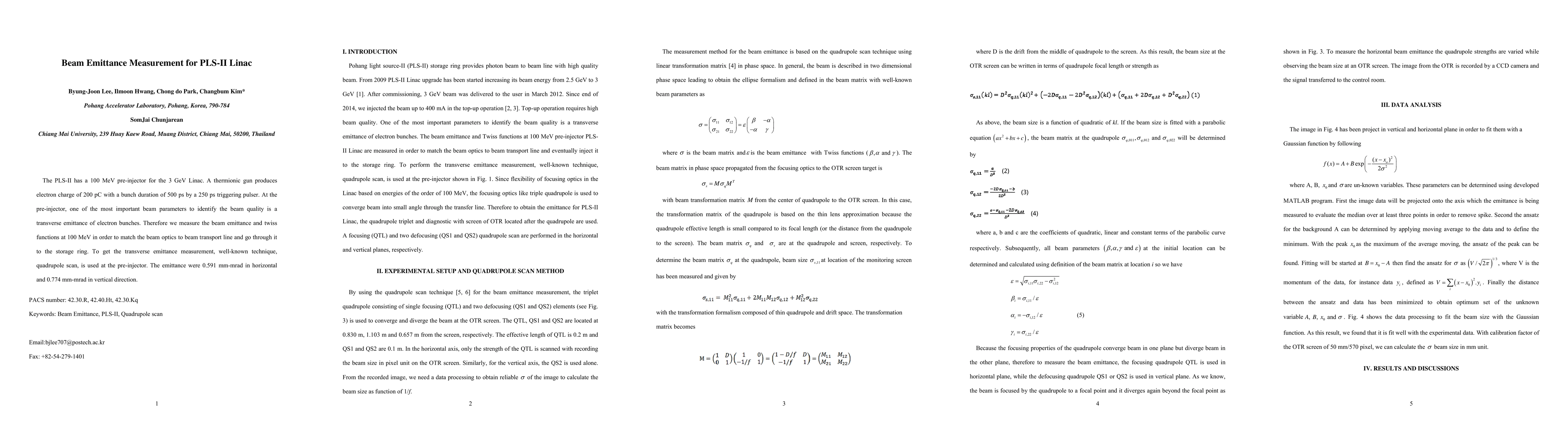 The paper presents a detailed method for beam emittance measurement using quadrupole scan technique, along with data analysis and fitting procedures for accurate beam size determination.